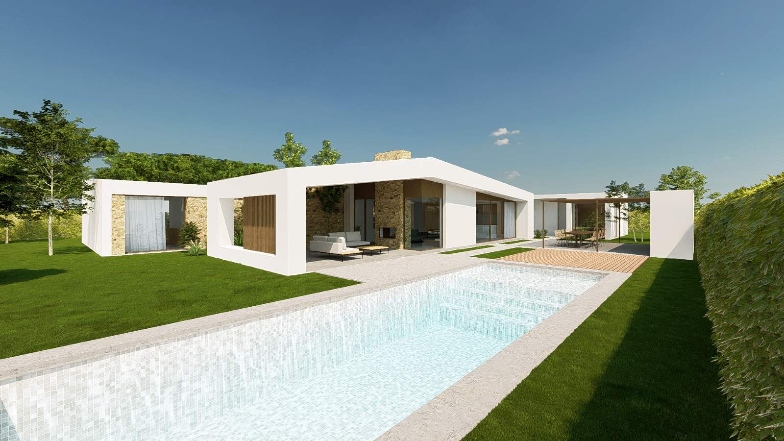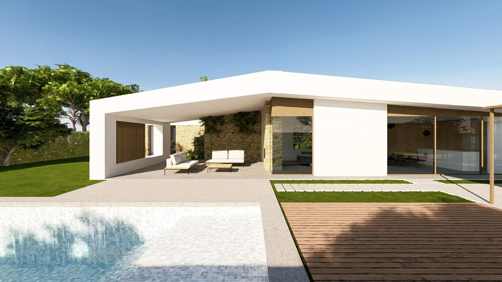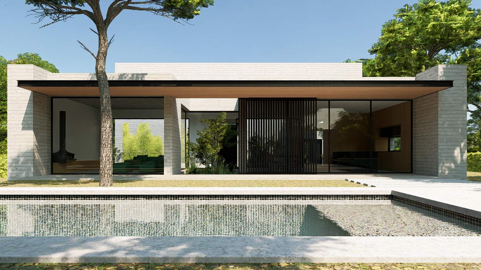 "Vivienda de una única planta inspirada en los diseños tradicionales como la cubierta a dos aguas y los muros de piedra pero reinterpretada con un lenguaje y un sistema constructivo de hoy en día."