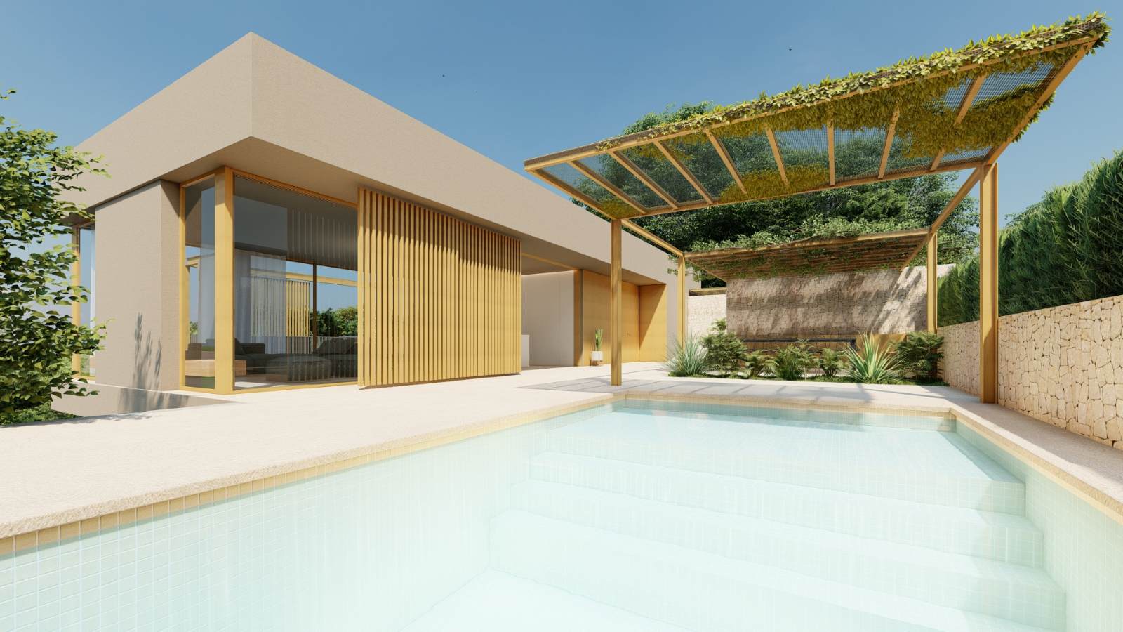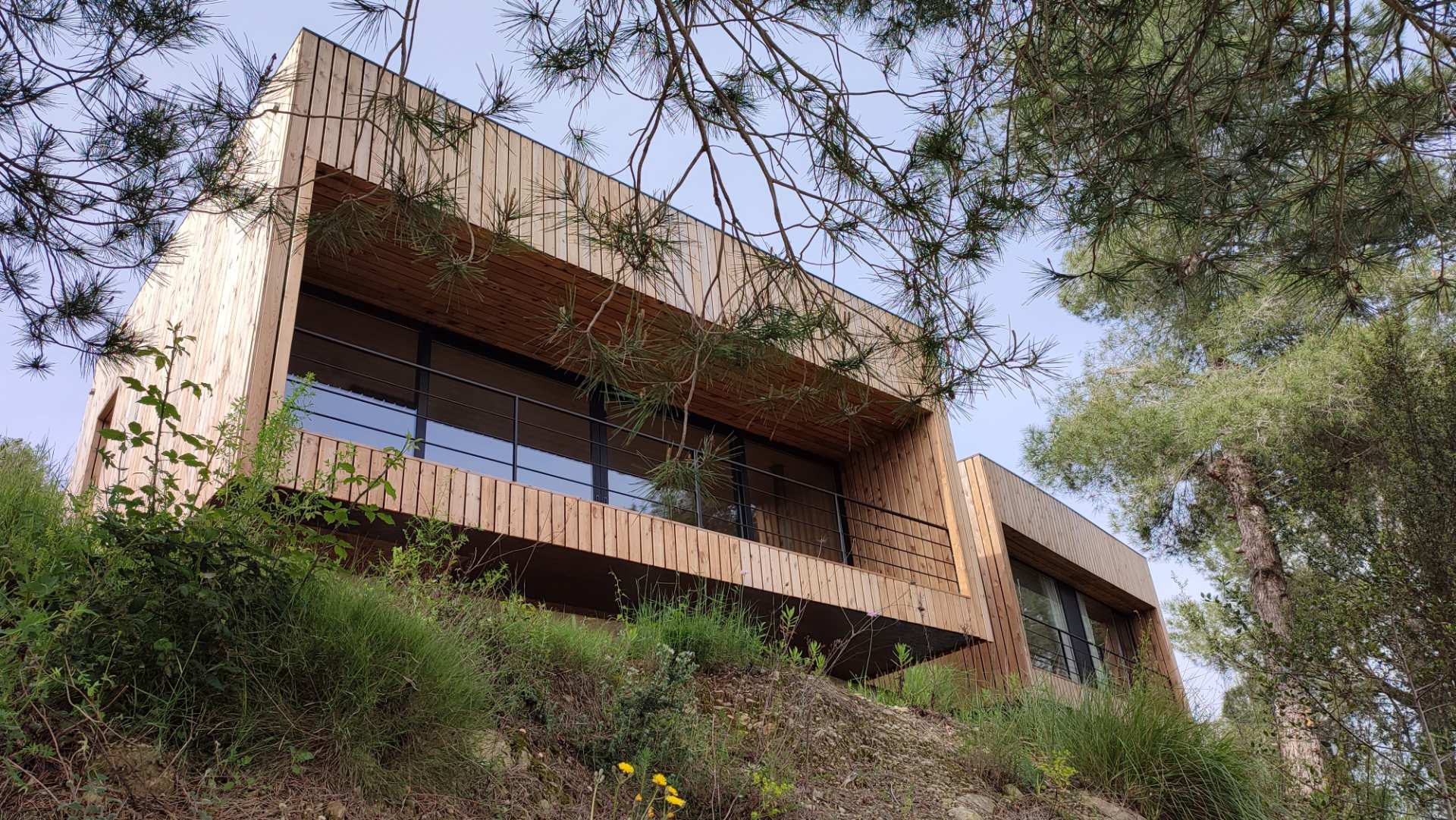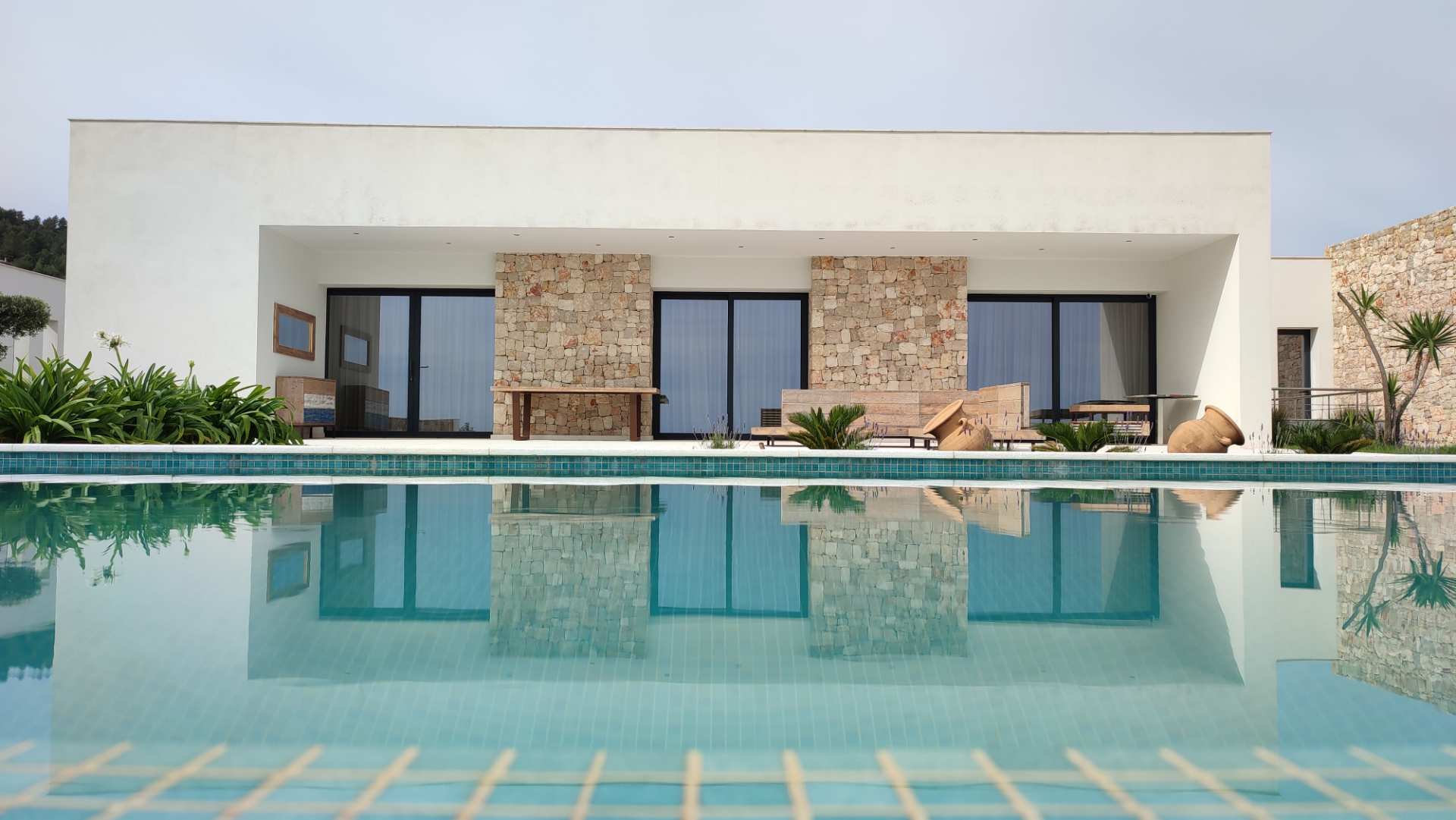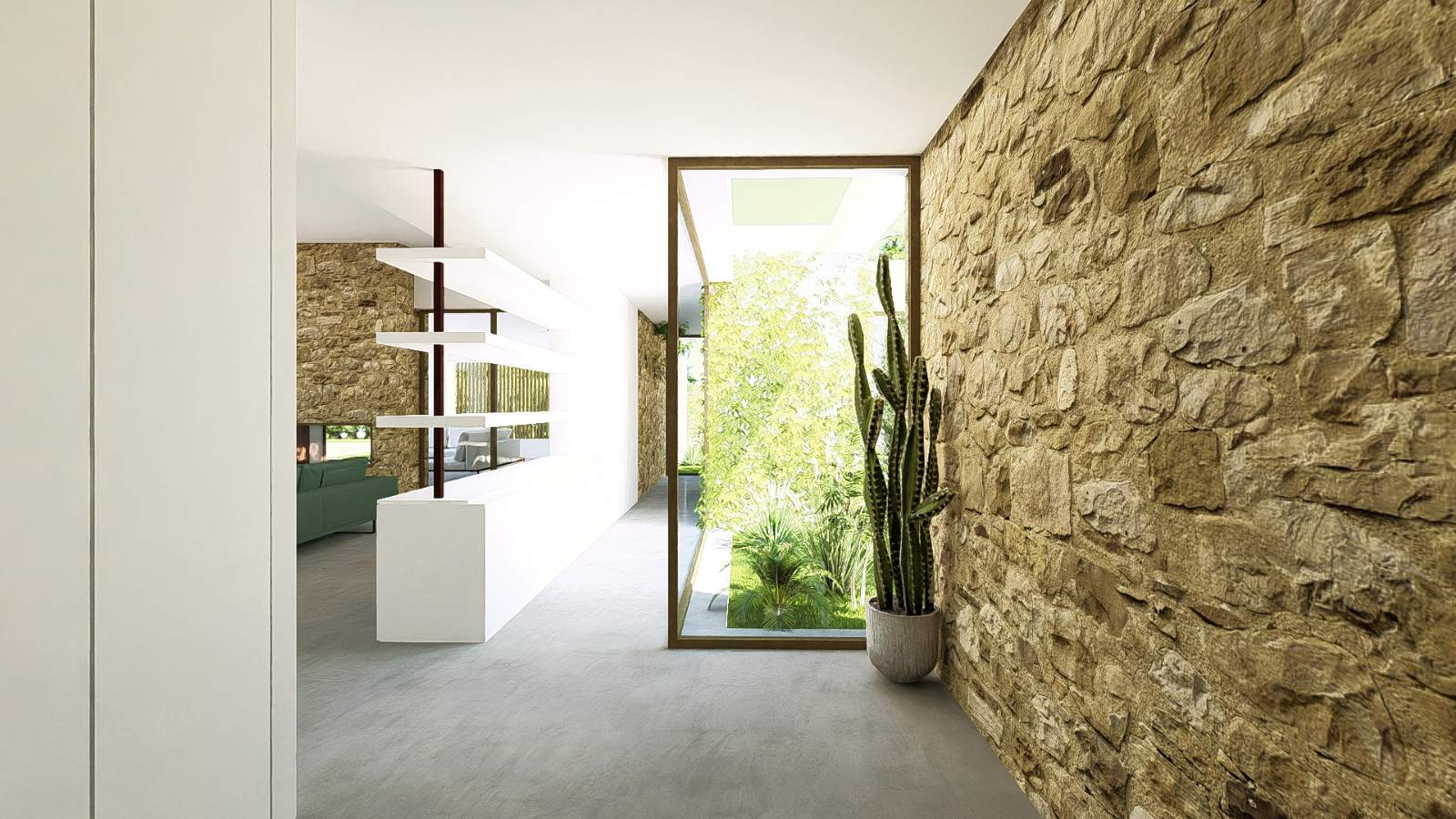 "Vivienda de una única planta inspirada en los diseños tradicionales como la cubierta a dos aguas y los muros de piedra pero reinterpretada con un lenguaje y un sistema constructivo de hoy en día."