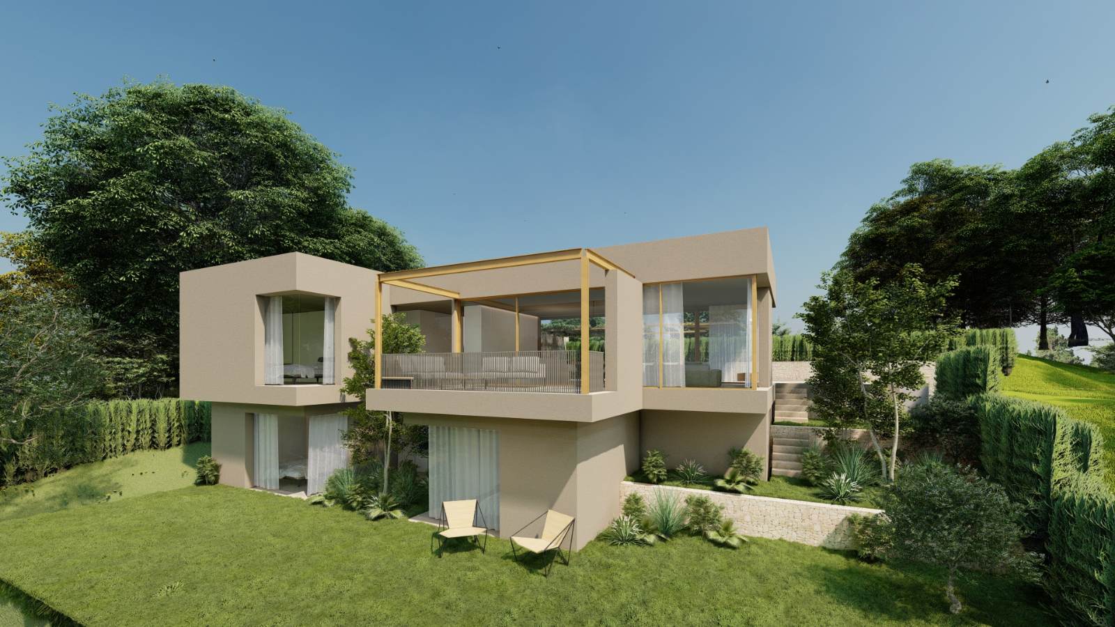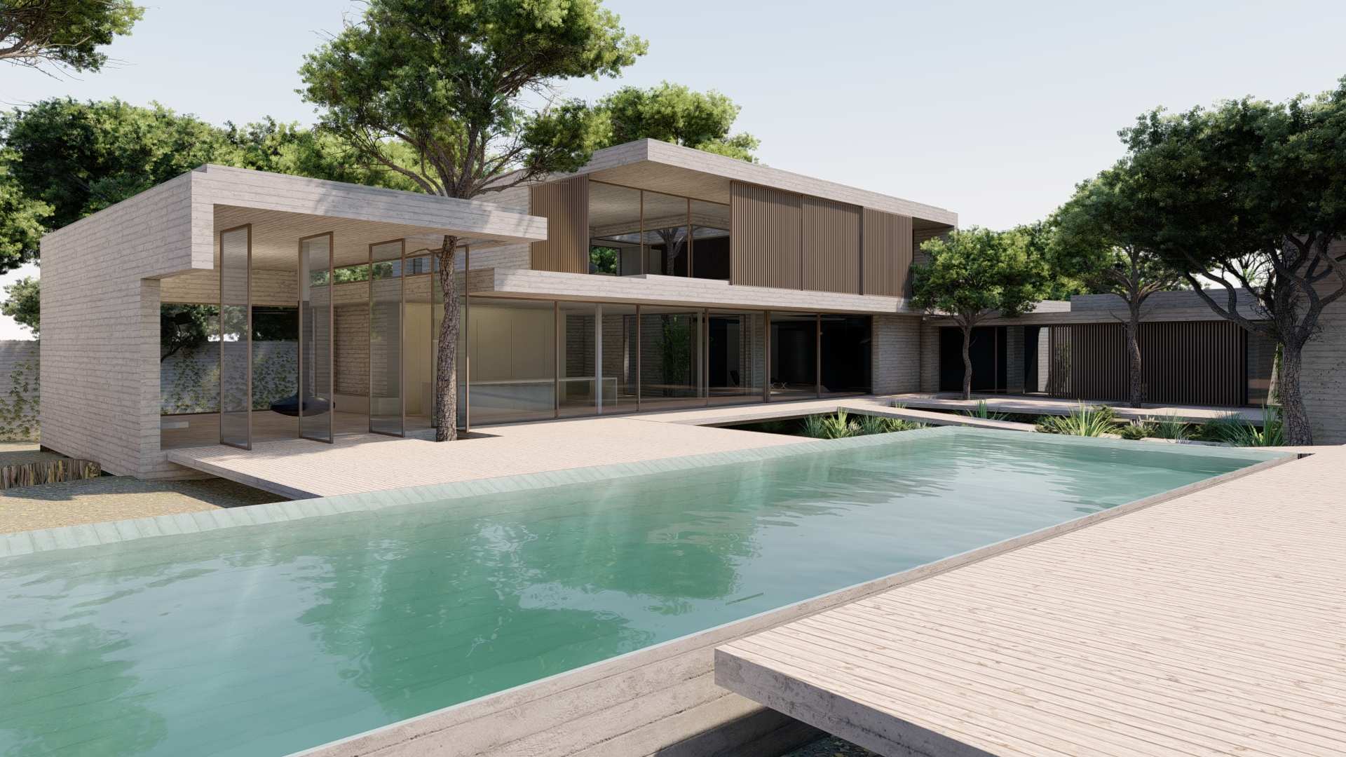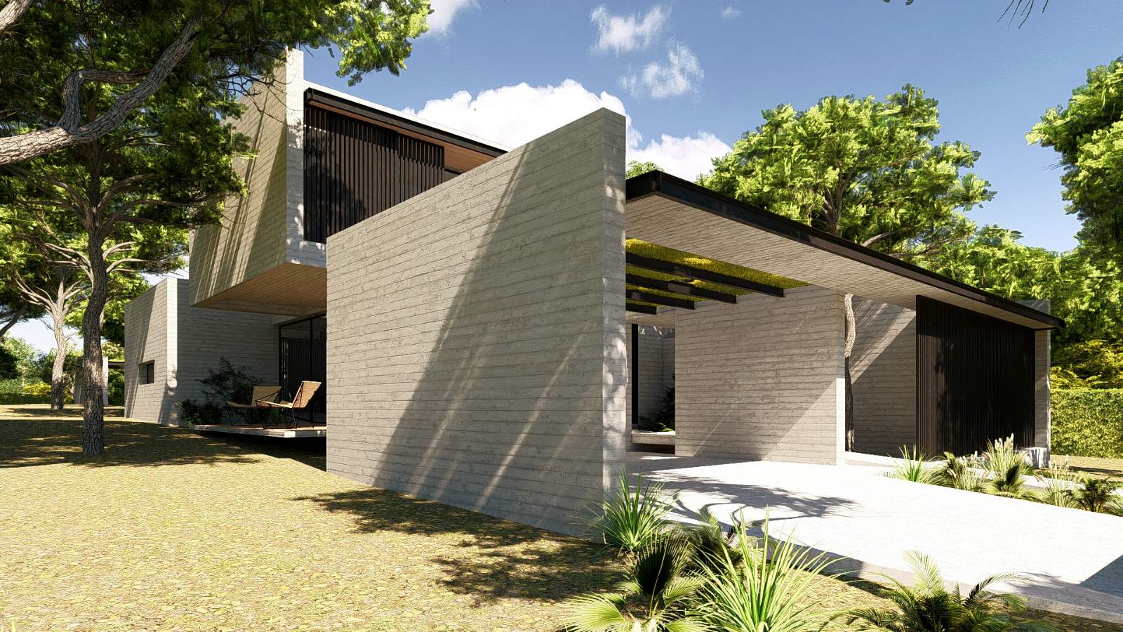 "Topografía con mucho desnivel y orientada a norte. Proponemos un diseño invertido, en el que se accede a la planta principal a cota de calle con los espacios exteriores dando a sur y con los dormitorios secundarios ubicados abajo con espacios ajardinados privados."