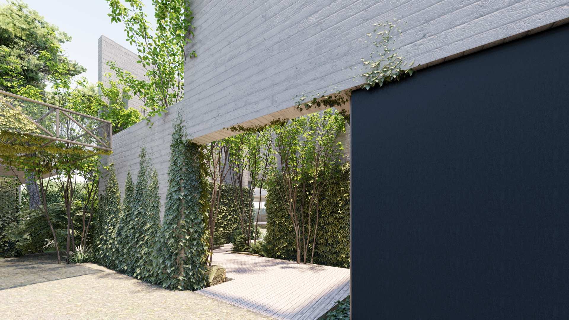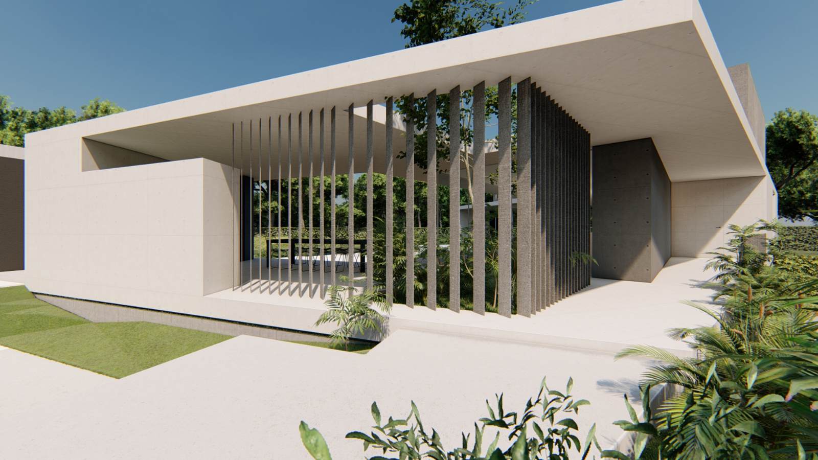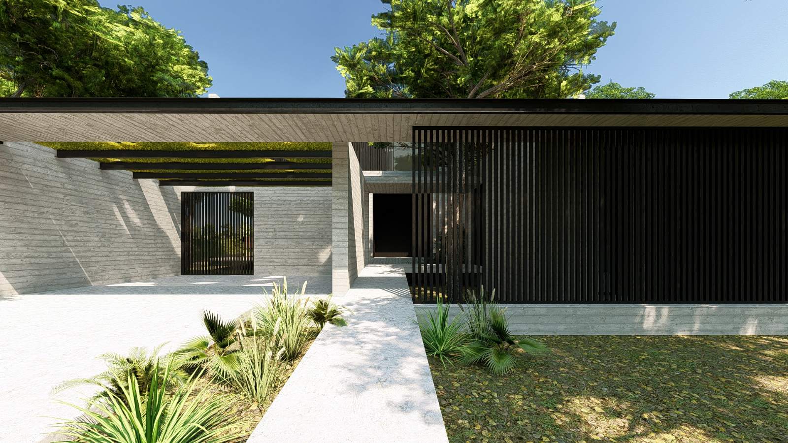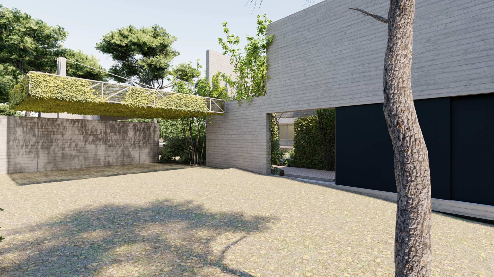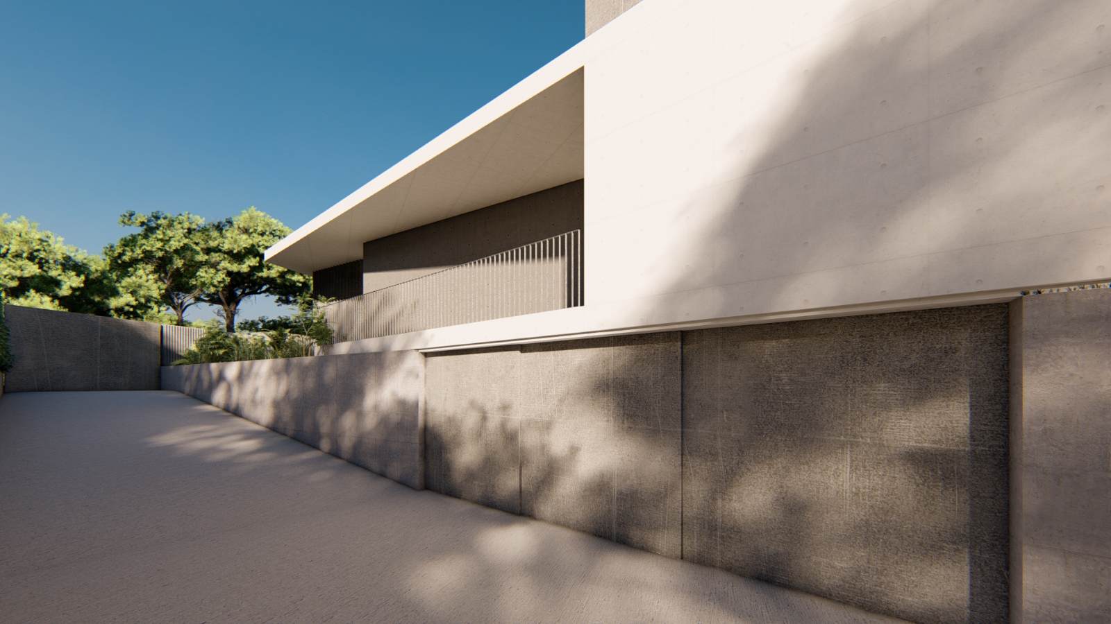 "Proyecto de hormigón visto que consiste en tres cajas comunicadas entres si mediante pasarelas y patios o jardines. Mediante rampas se consigue resolver el desnivel de la parcela."
