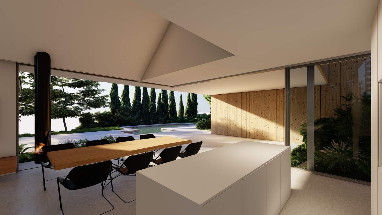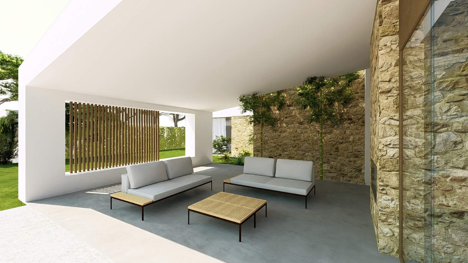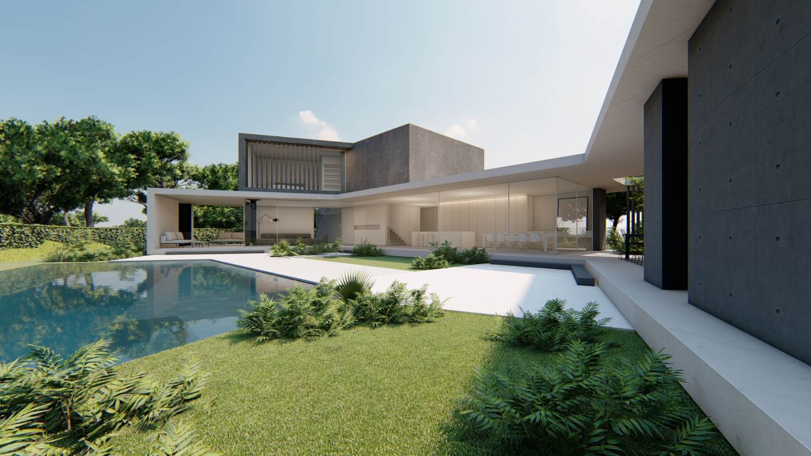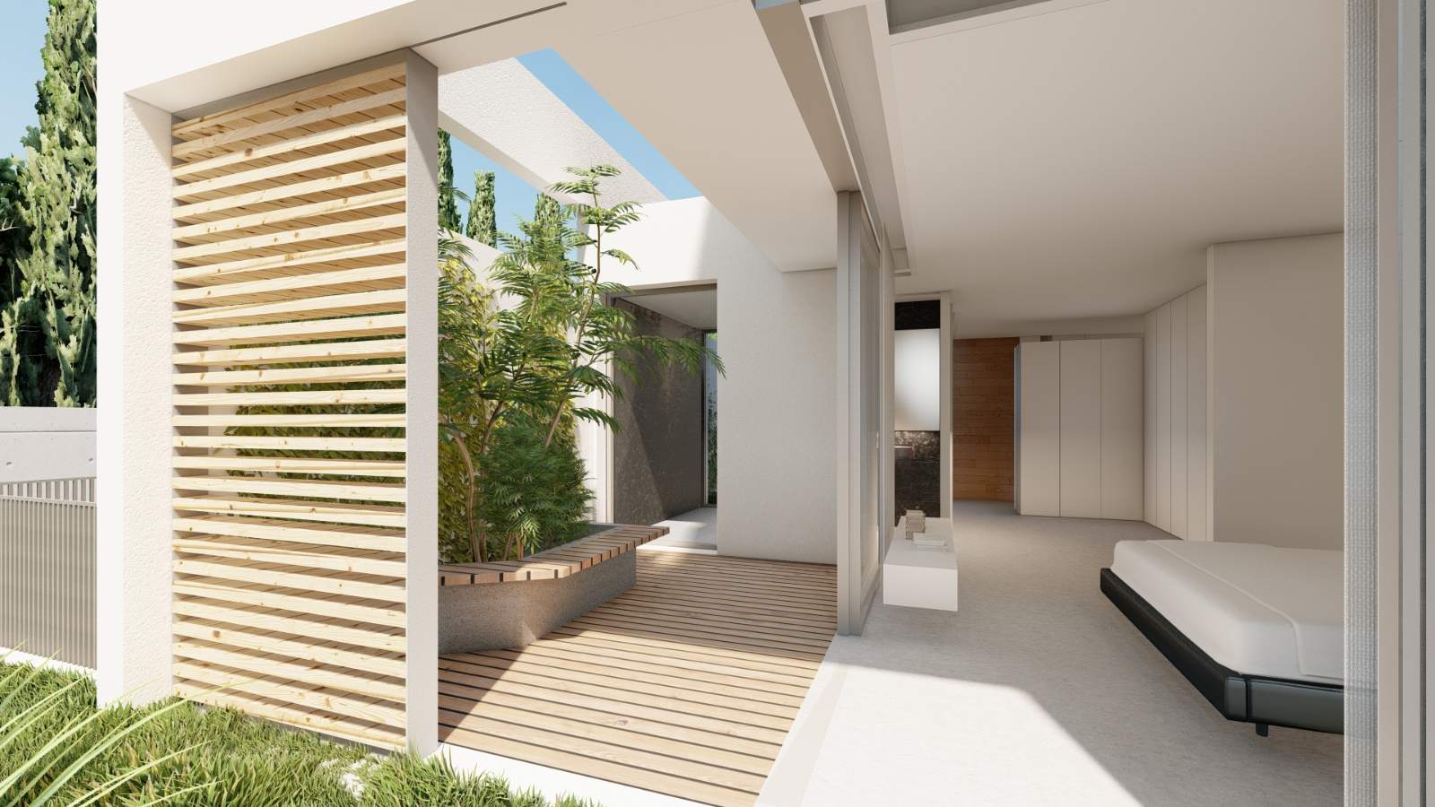 "Vivienda en forma de L que resuelve la secuencia comedor exterior - terraza exterior- estancias principales y dormitorios de forma degradada y sin tensiones. Una espectacular suite principal corona la casa y mira hacia la zona de la piscina y hacia el mar."