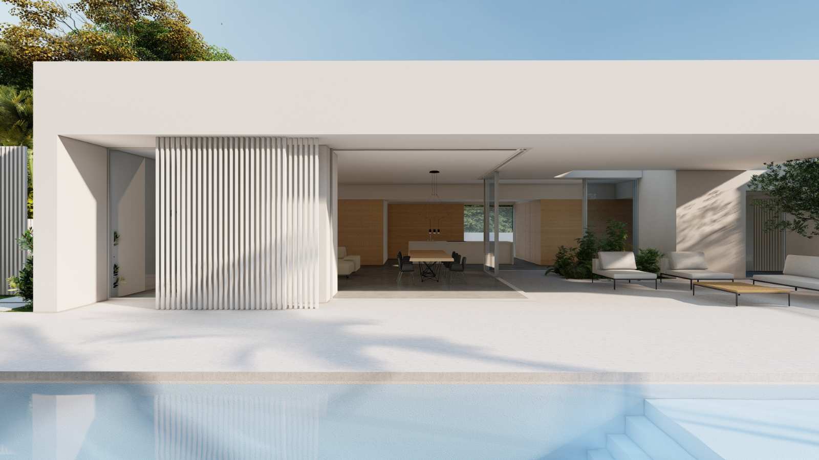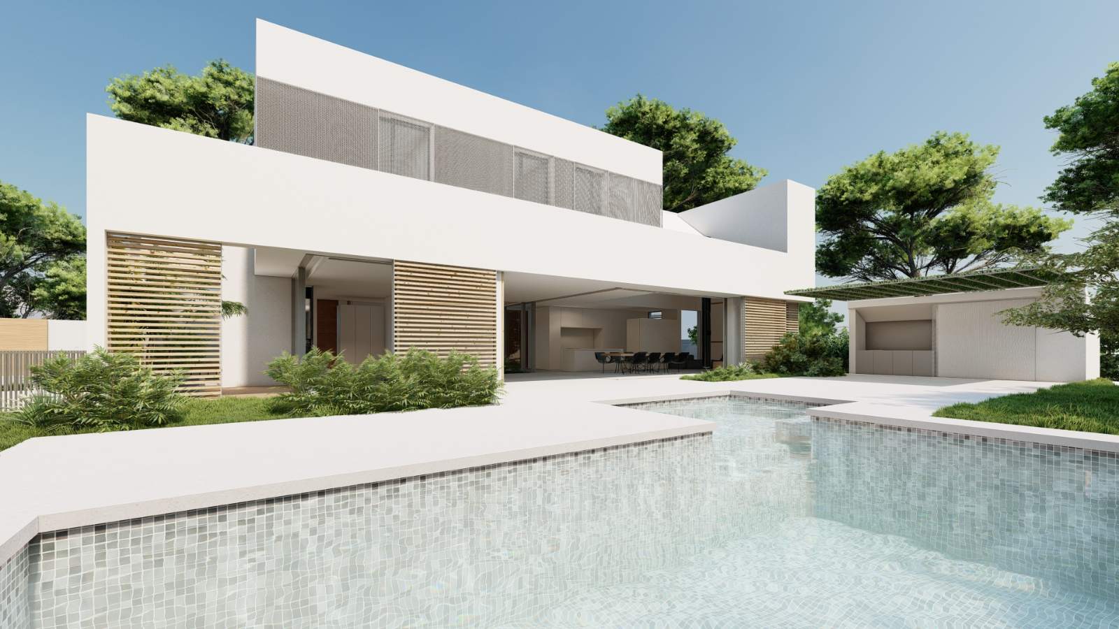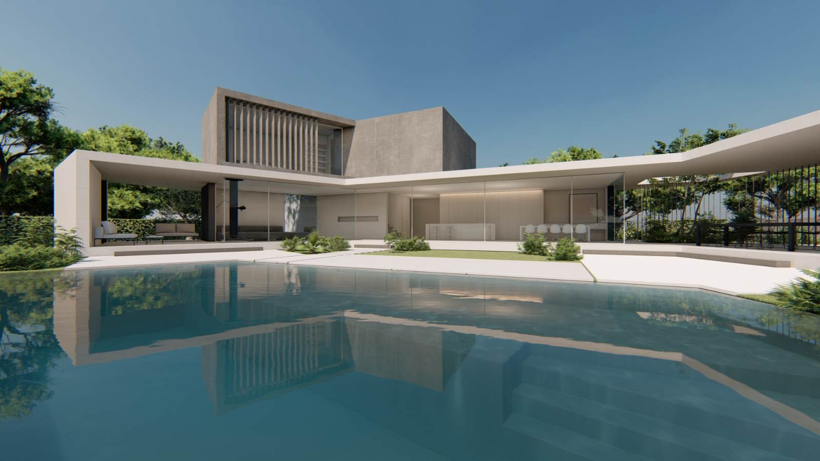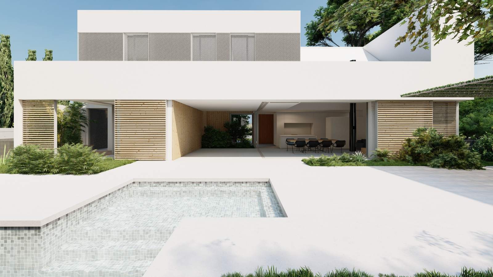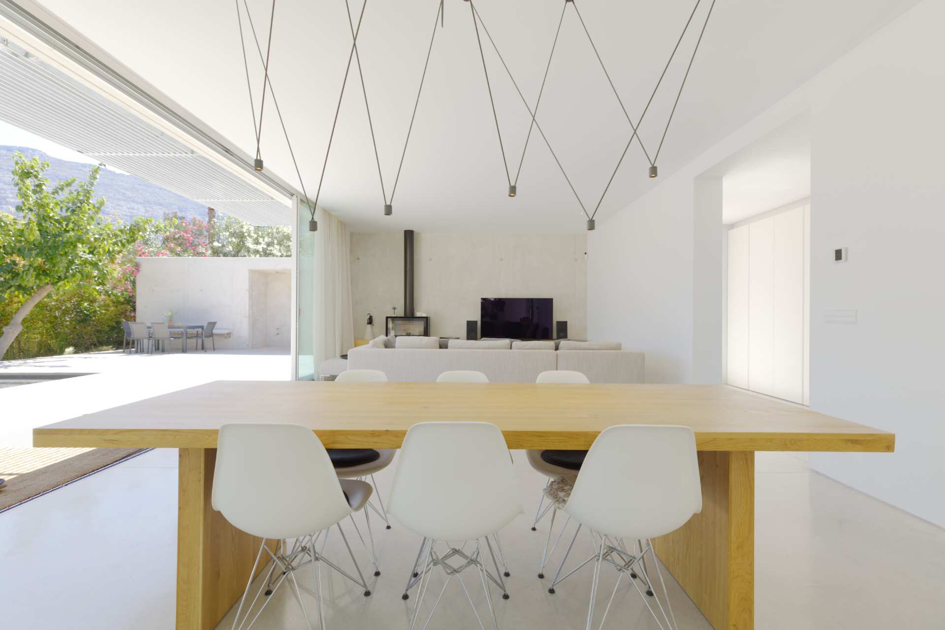 "Vivienda en forma de L que resuelve la secuencia comedor exterior - terraza exterior- estancias principales y dormitorios de forma degradada y sin tensiones. Una espectacular suite principal corona la casa y mira hacia la zona de la piscina y hacia el mar."