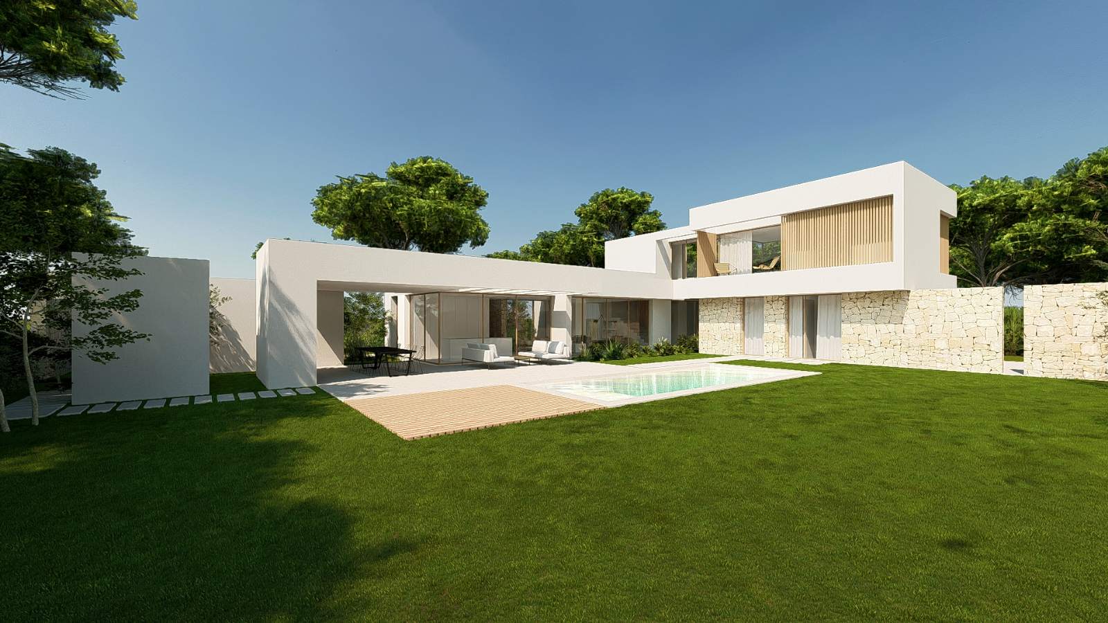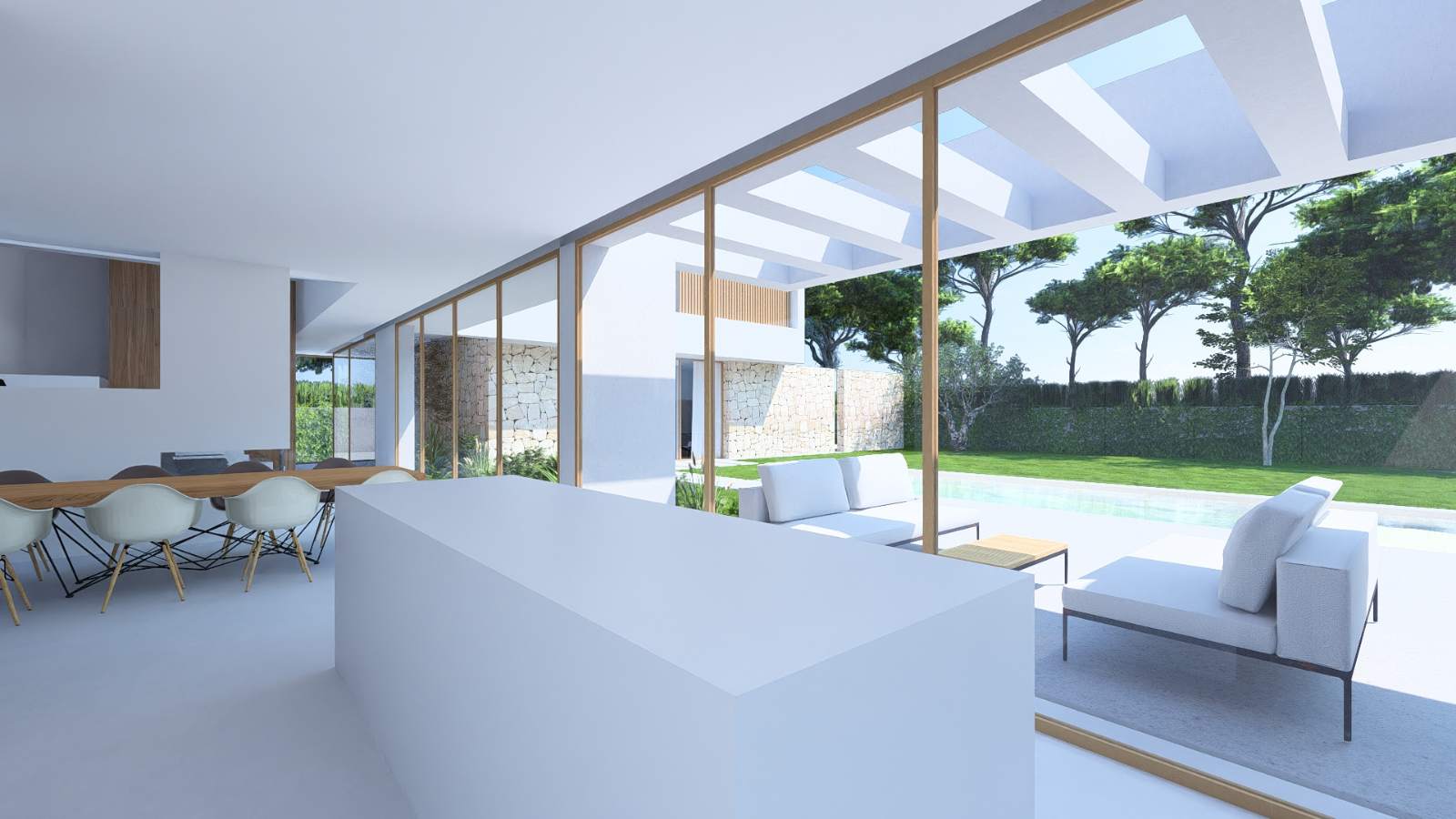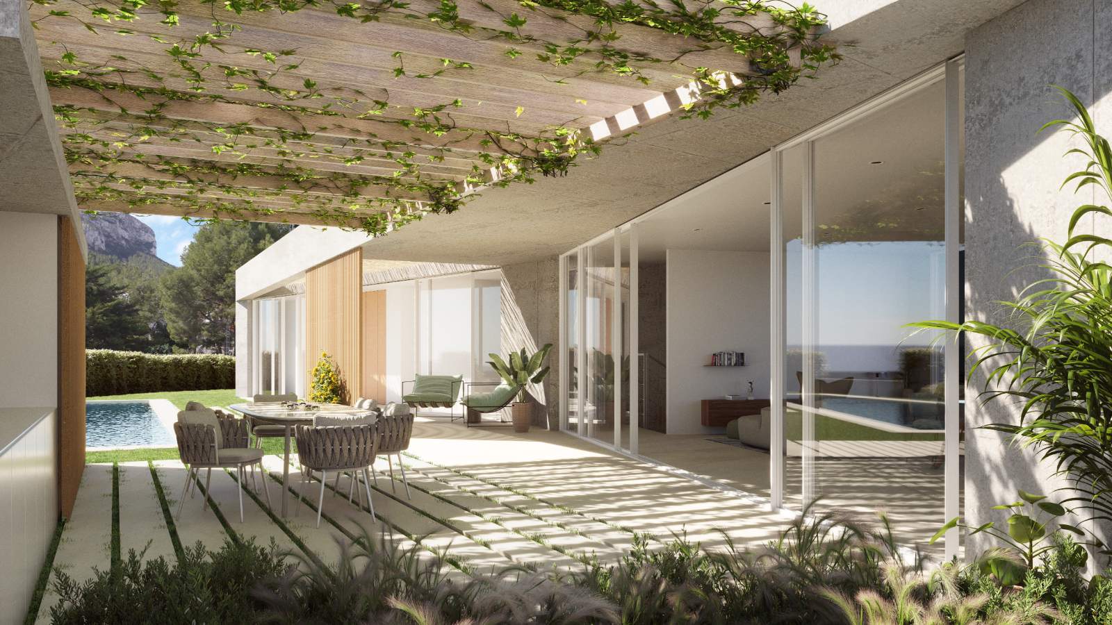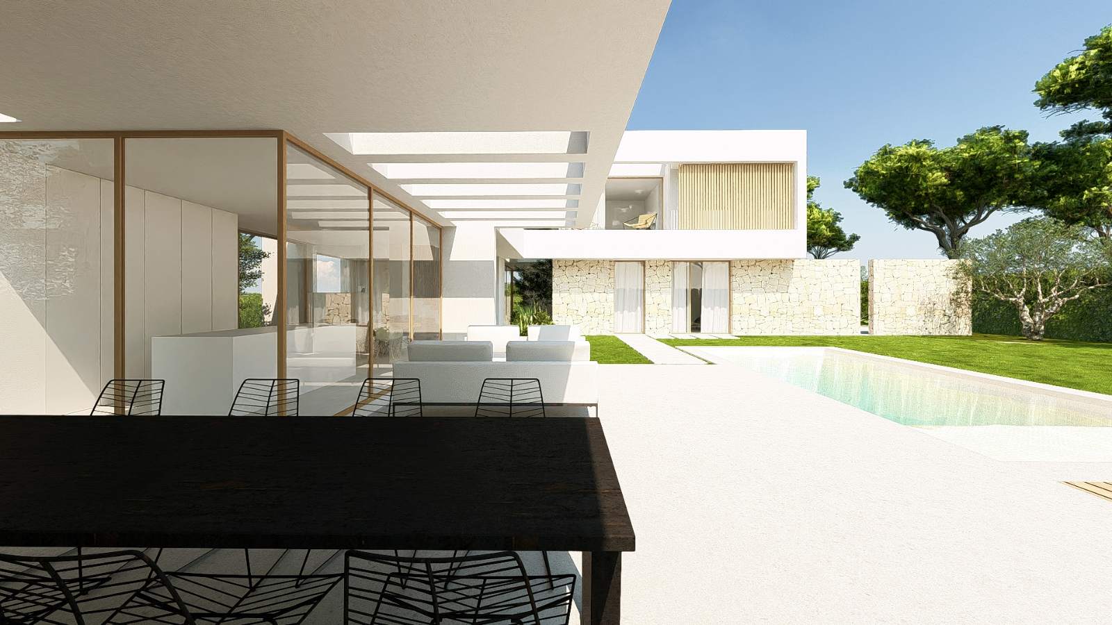 "Vivienda en forma de L que resuelve la secuencia comedor exterior - terraza exterior- estancias principales y dormitorios de forma degradada y sin tensiones. Una espectacular suite principal corona la casa y mira hacia la zona de la piscina y hacia el mar."