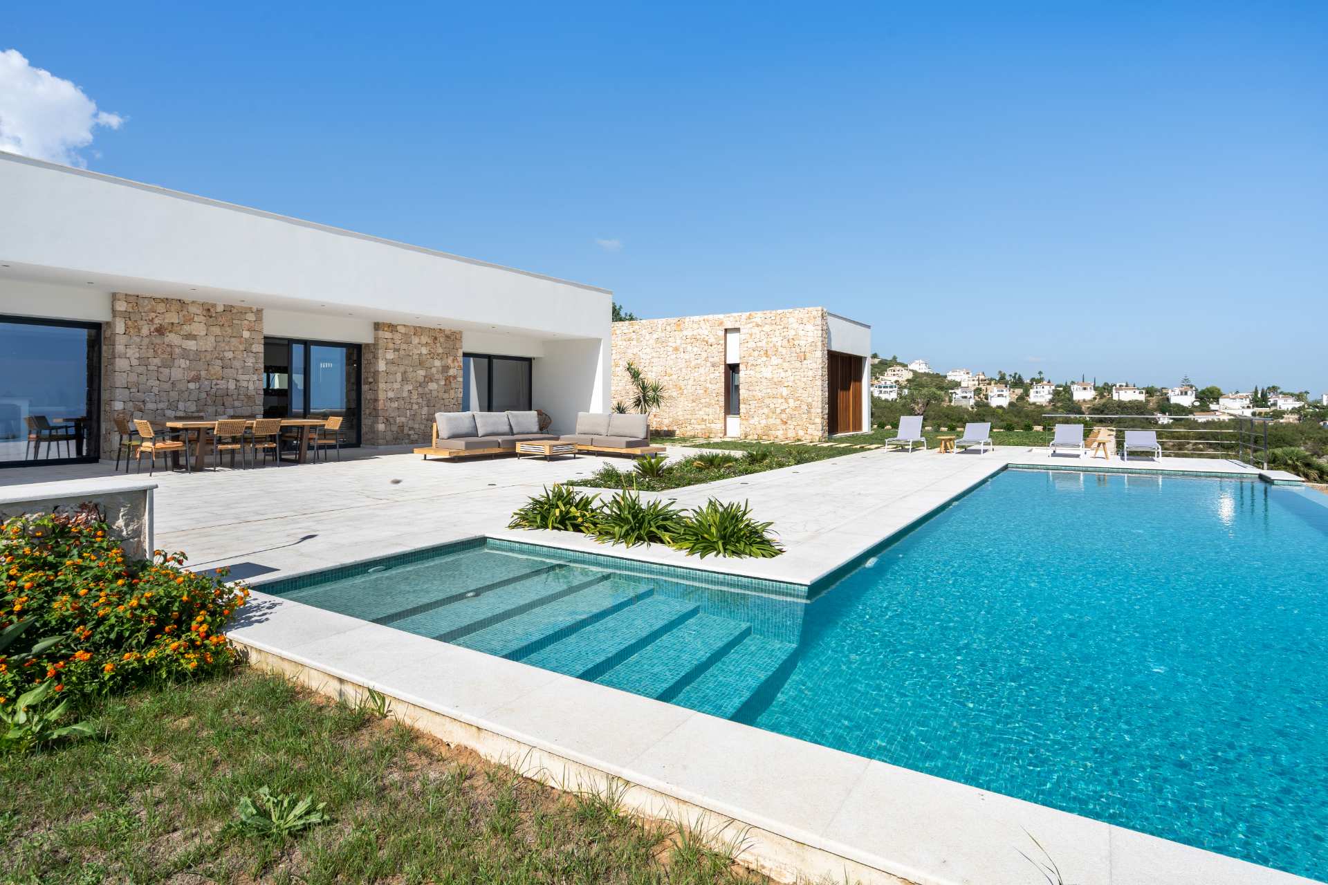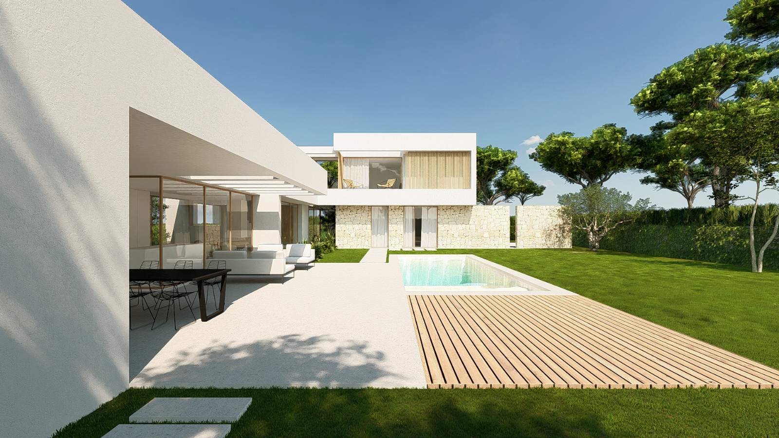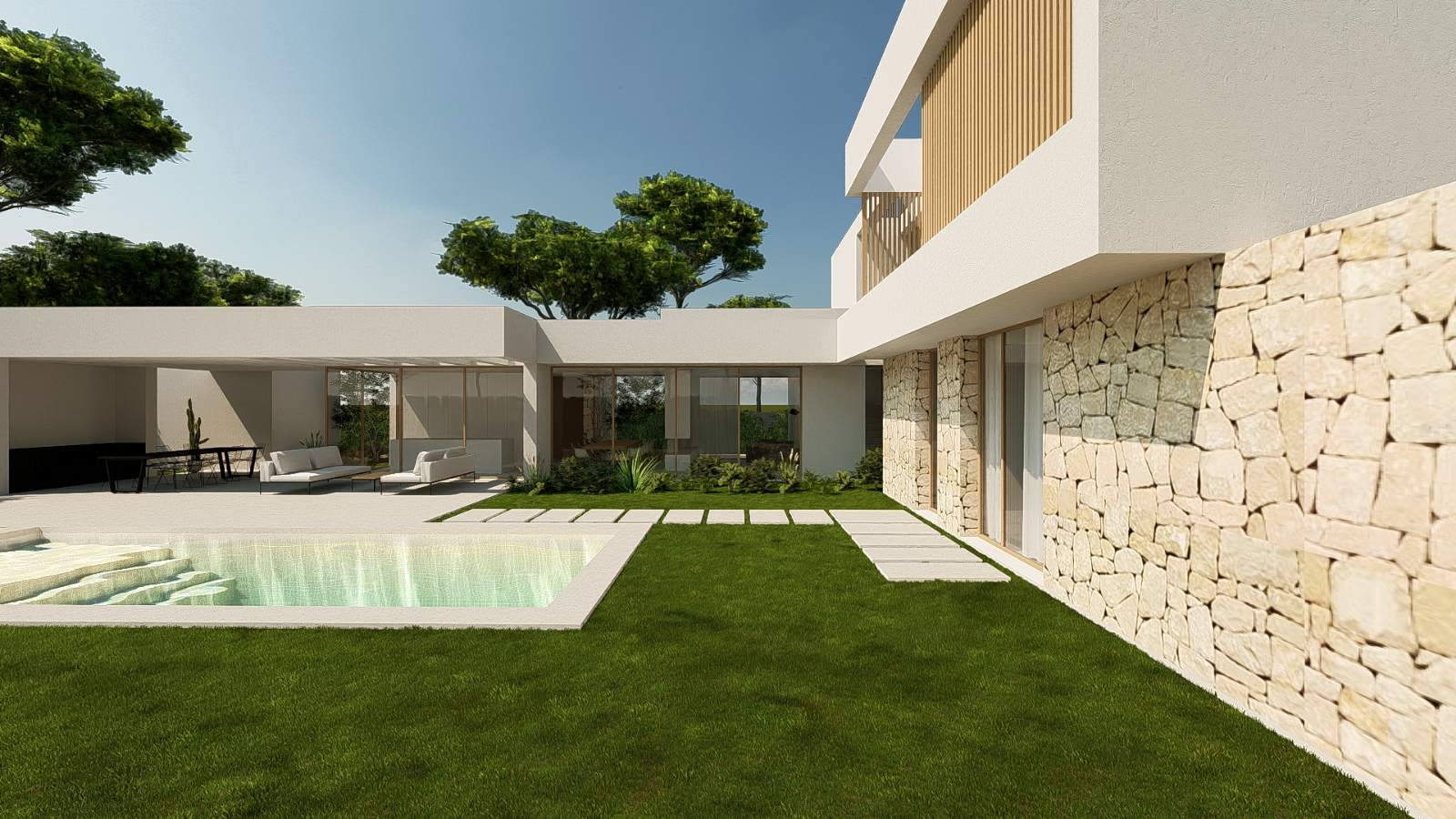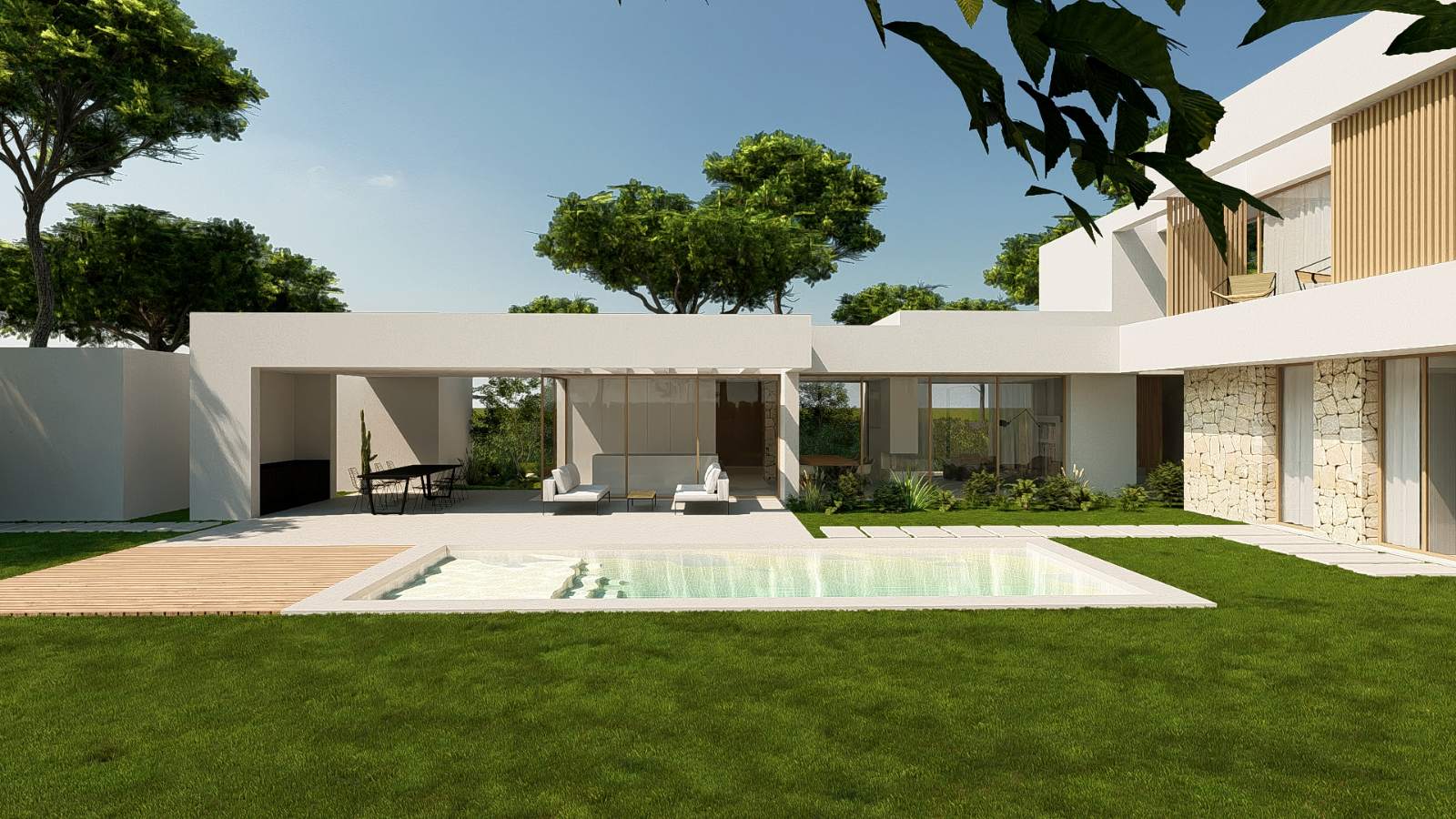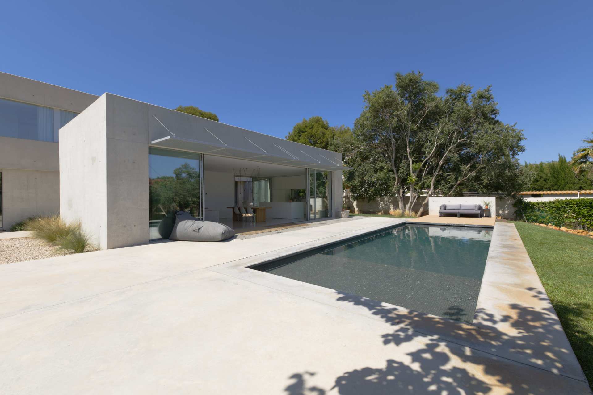 "Vivienda en forma de L que resuelve la secuencia comedor exterior - terraza exterior- estancias principales y dormitorios de forma degradada y sin tensiones. Una espectacular suite principal corona la casa y mira hacia la zona de la piscina y hacia el mar."