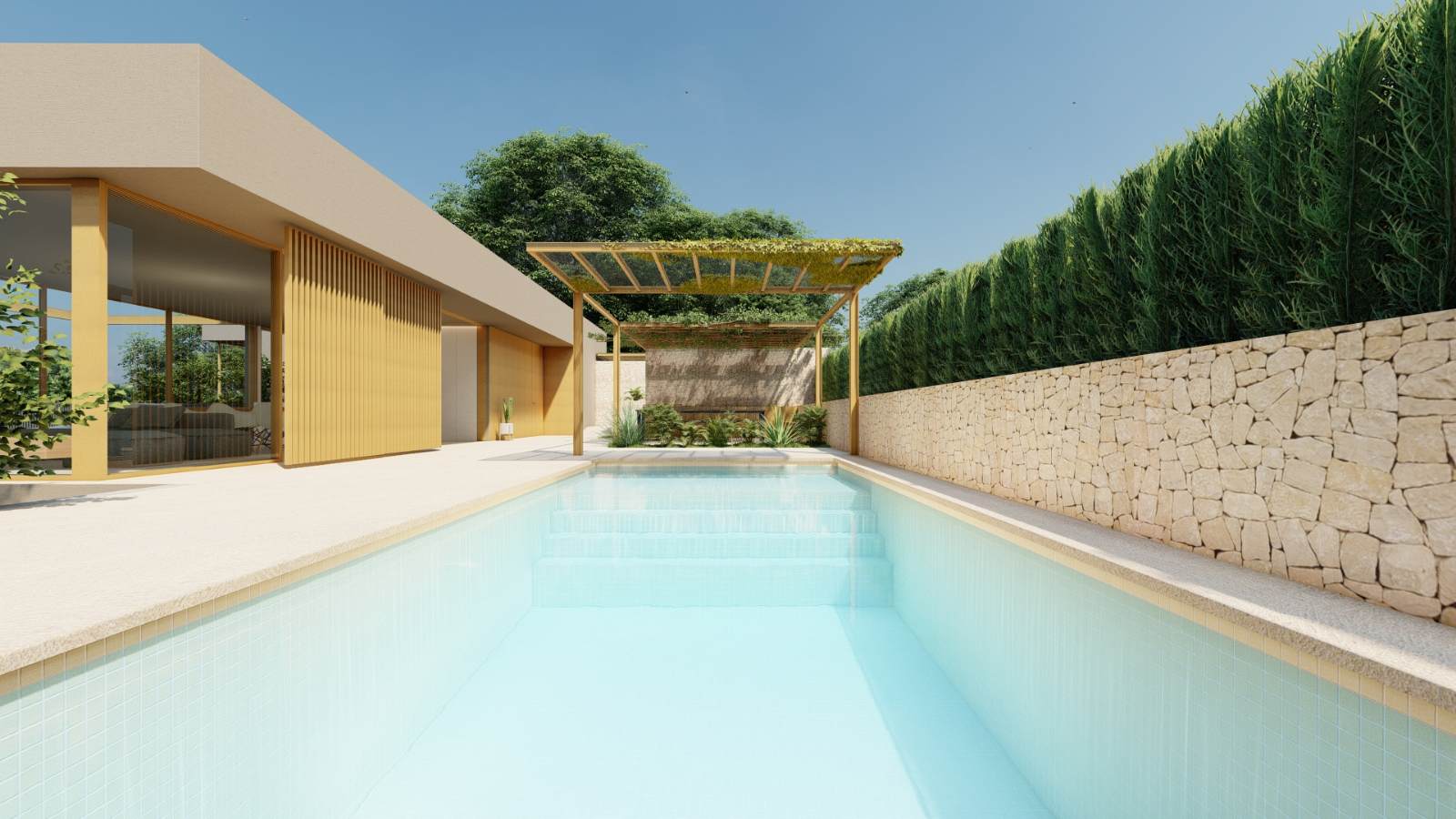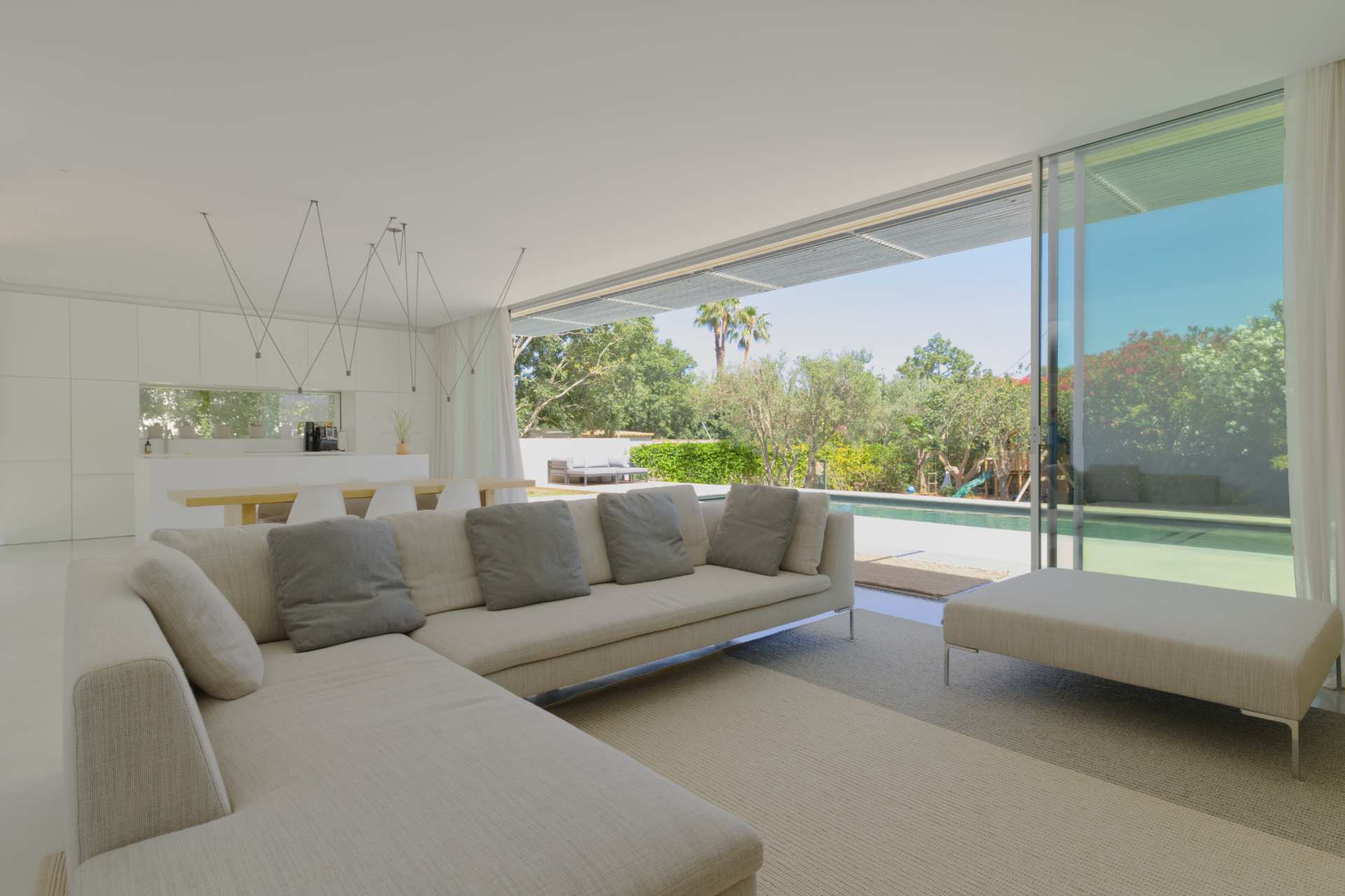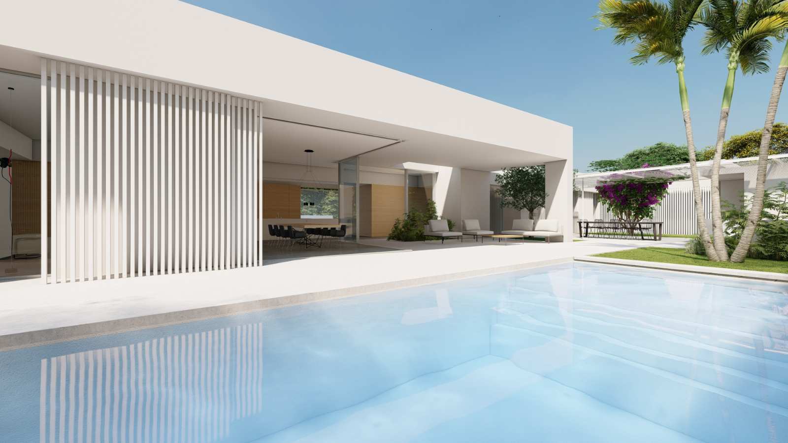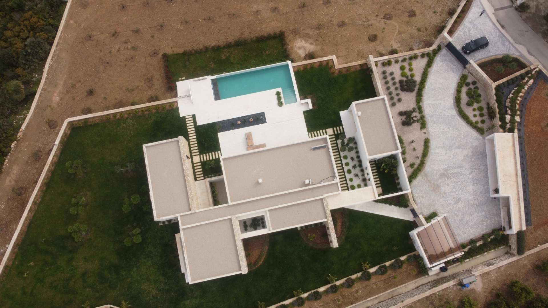 "Vivienda en forma de L que resuelve la secuencia comedor exterior - terraza exterior- estancias principales y dormitorios de forma degradada y sin tensiones. Una espectacular suite principal corona la casa y mira hacia la zona de la piscina y hacia el mar."
