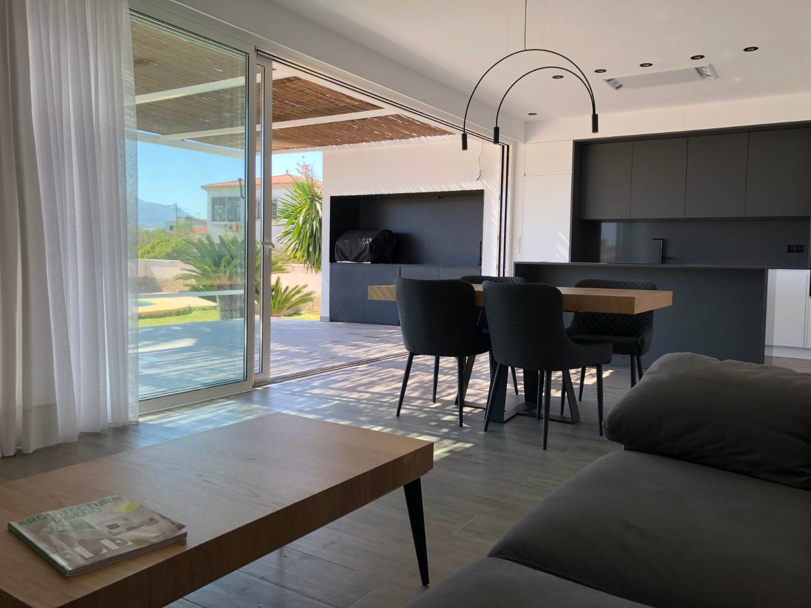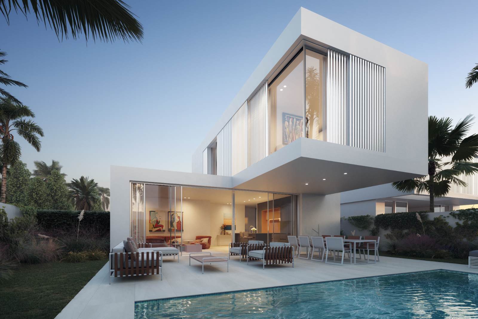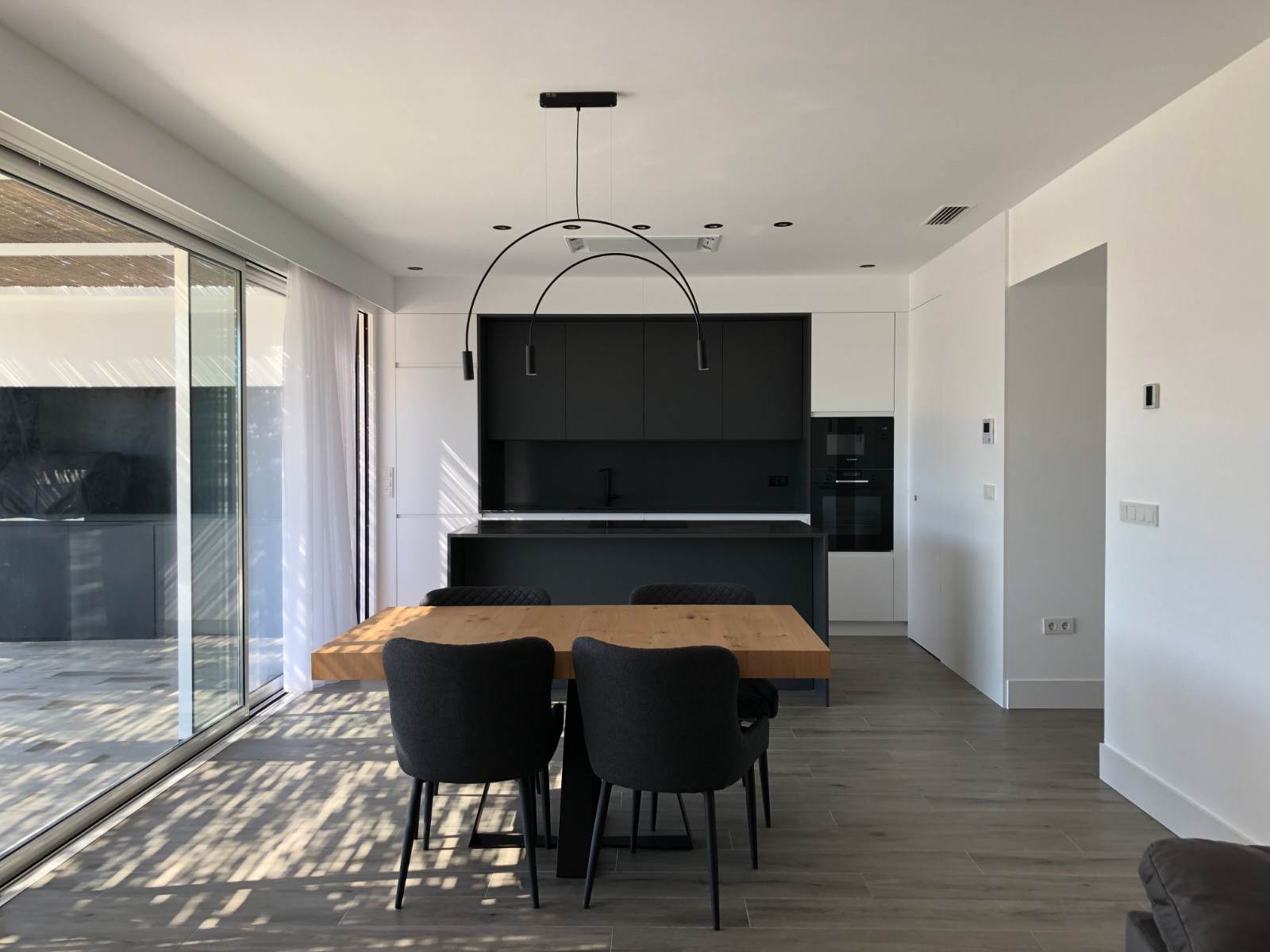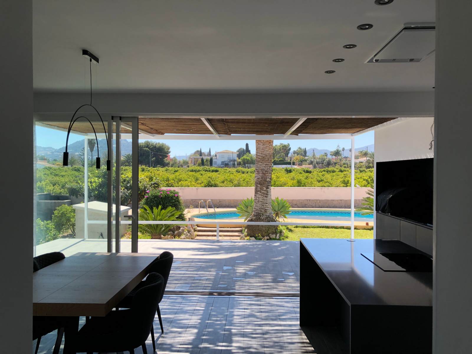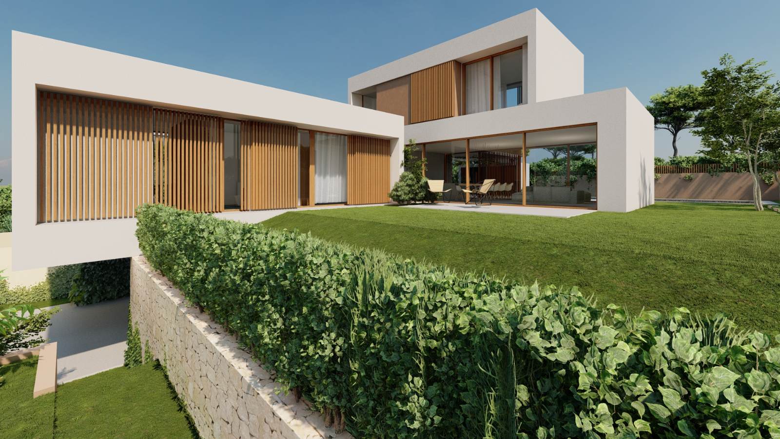 "Vivienda en forma de L que resuelve la secuencia comedor exterior - terraza exterior- estancias principales y dormitorios de forma degradada y sin tensiones. Una espectacular suite principal corona la casa y mira hacia la zona de la piscina y hacia el mar."
