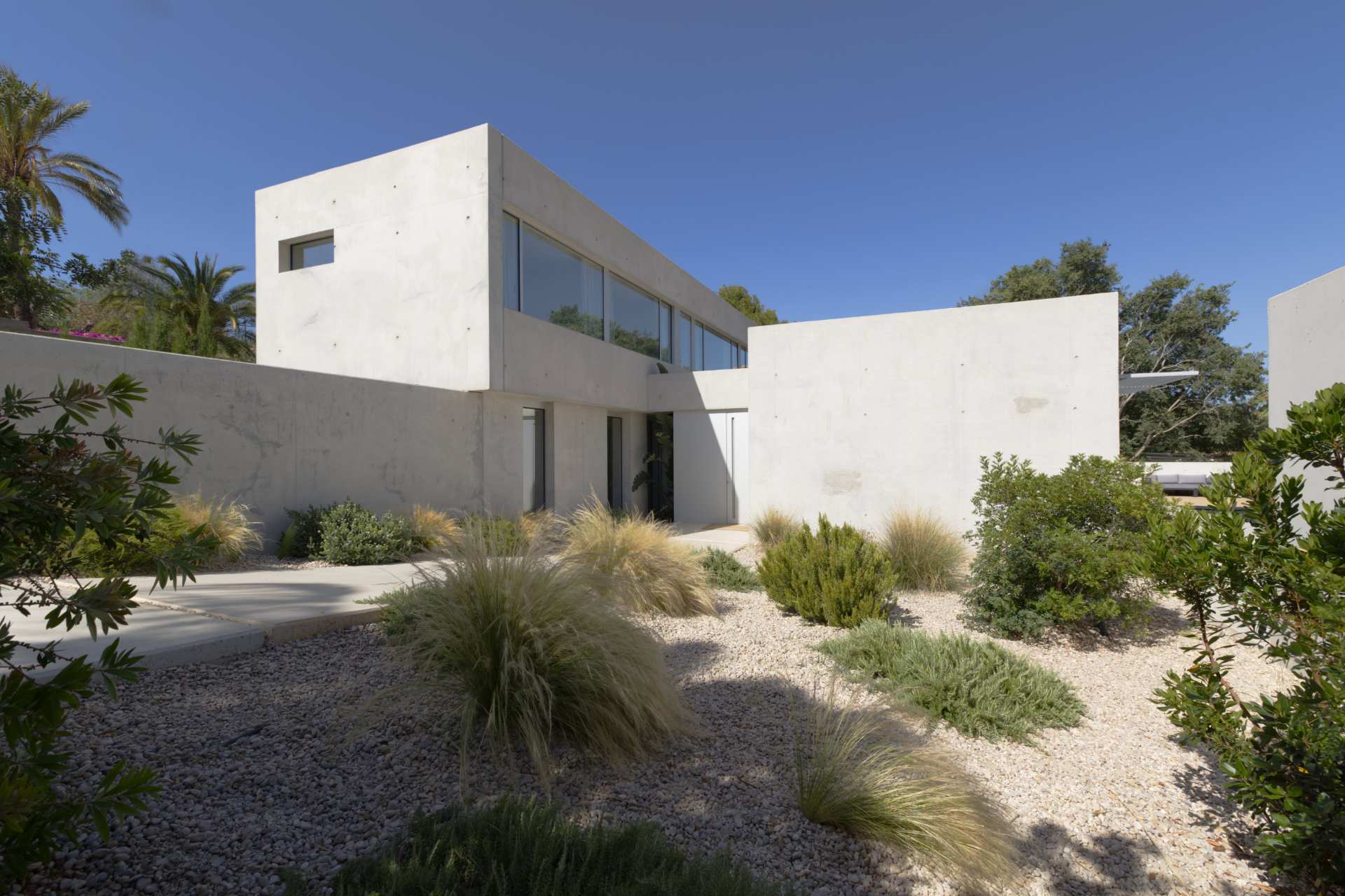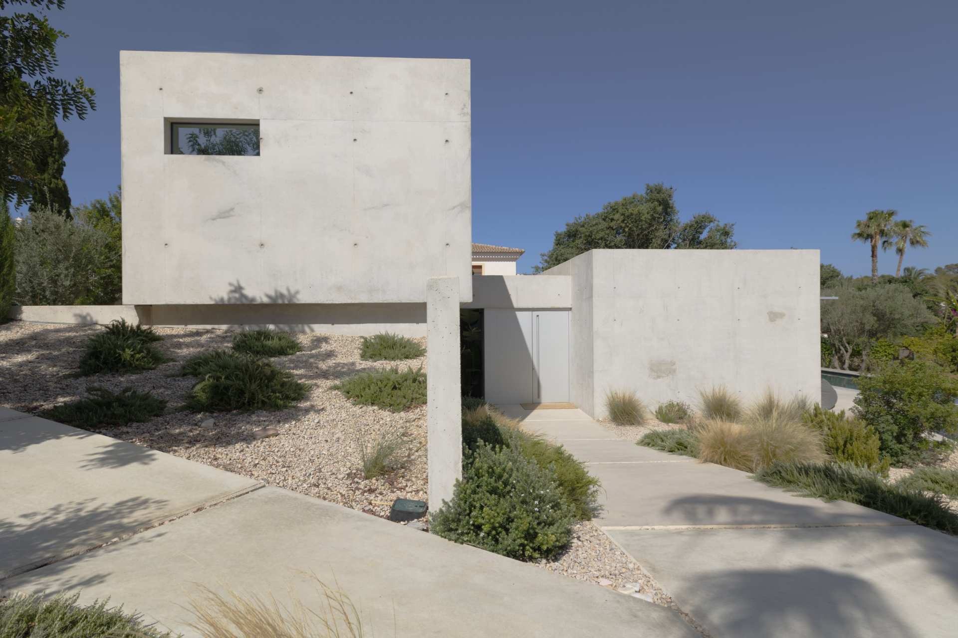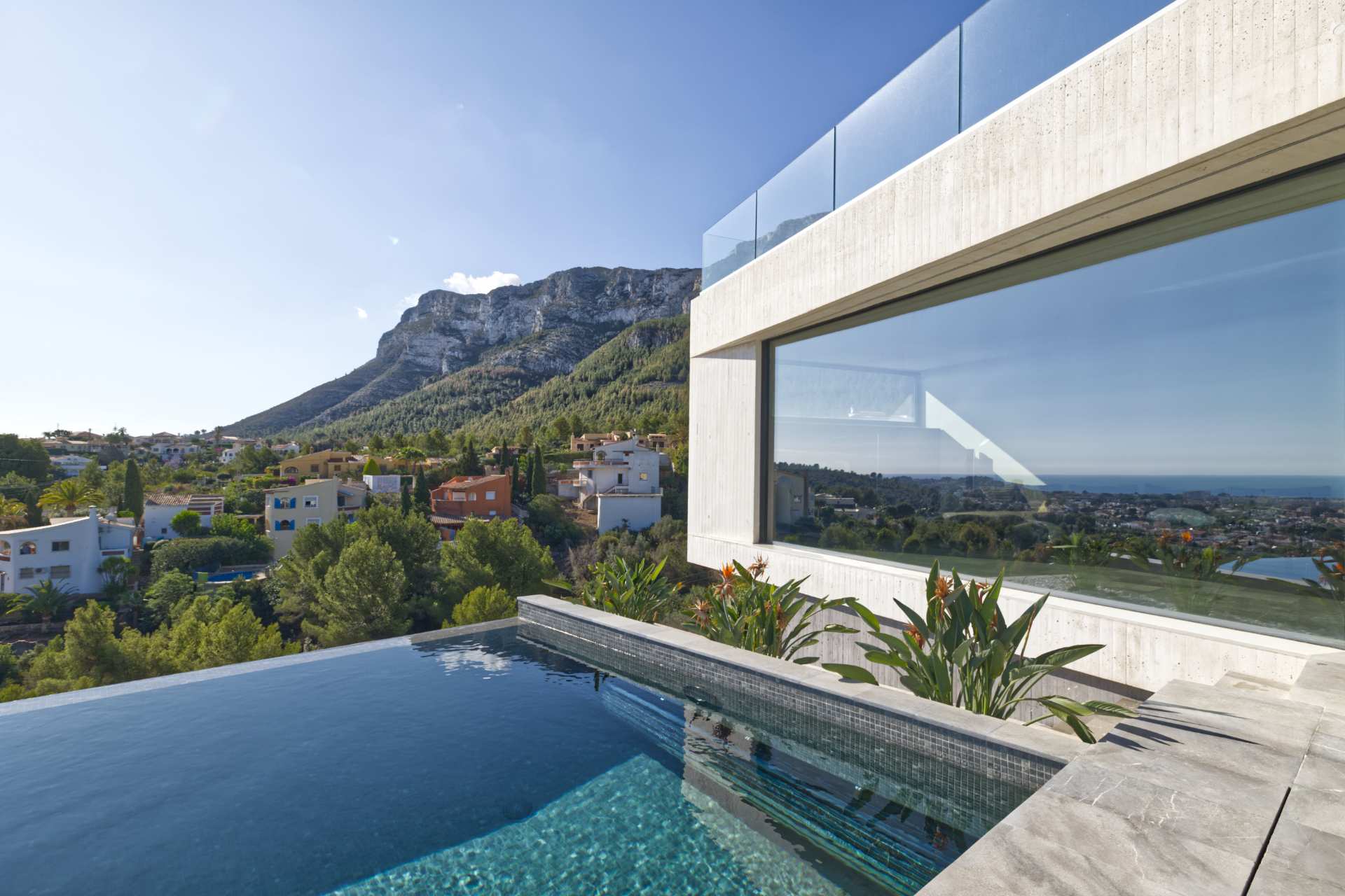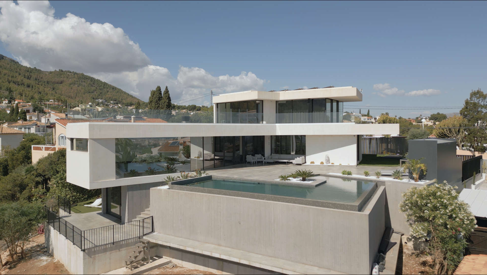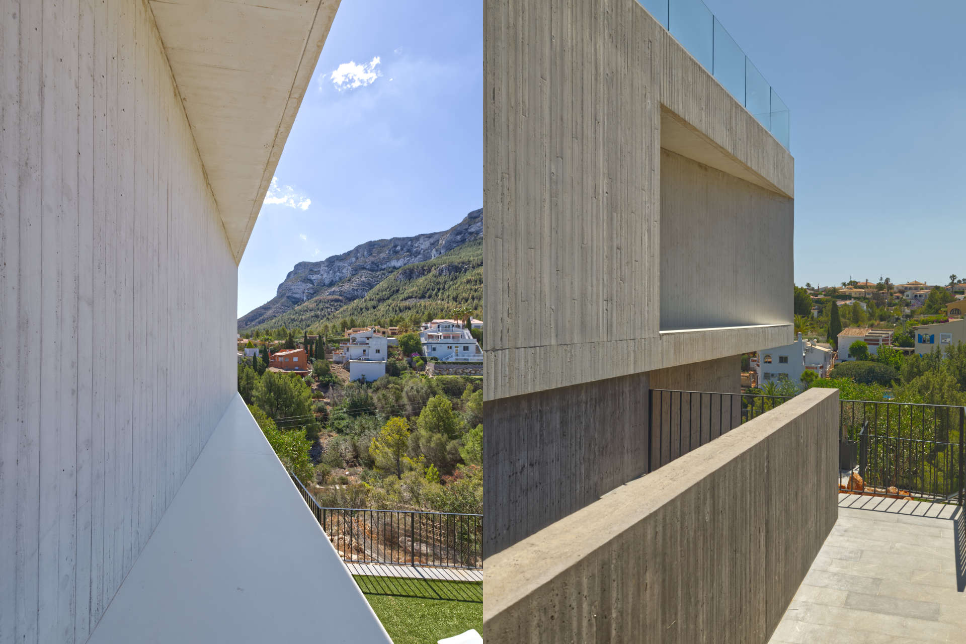 "Una vivienda en hormigón blanco con unas maravillosas vistas a Dénia que emerge como una escultura, con un gran voladizo y con el fuerte objetivo de no poner barandillas ni ningún elemento que interrumpiese esas vistas."