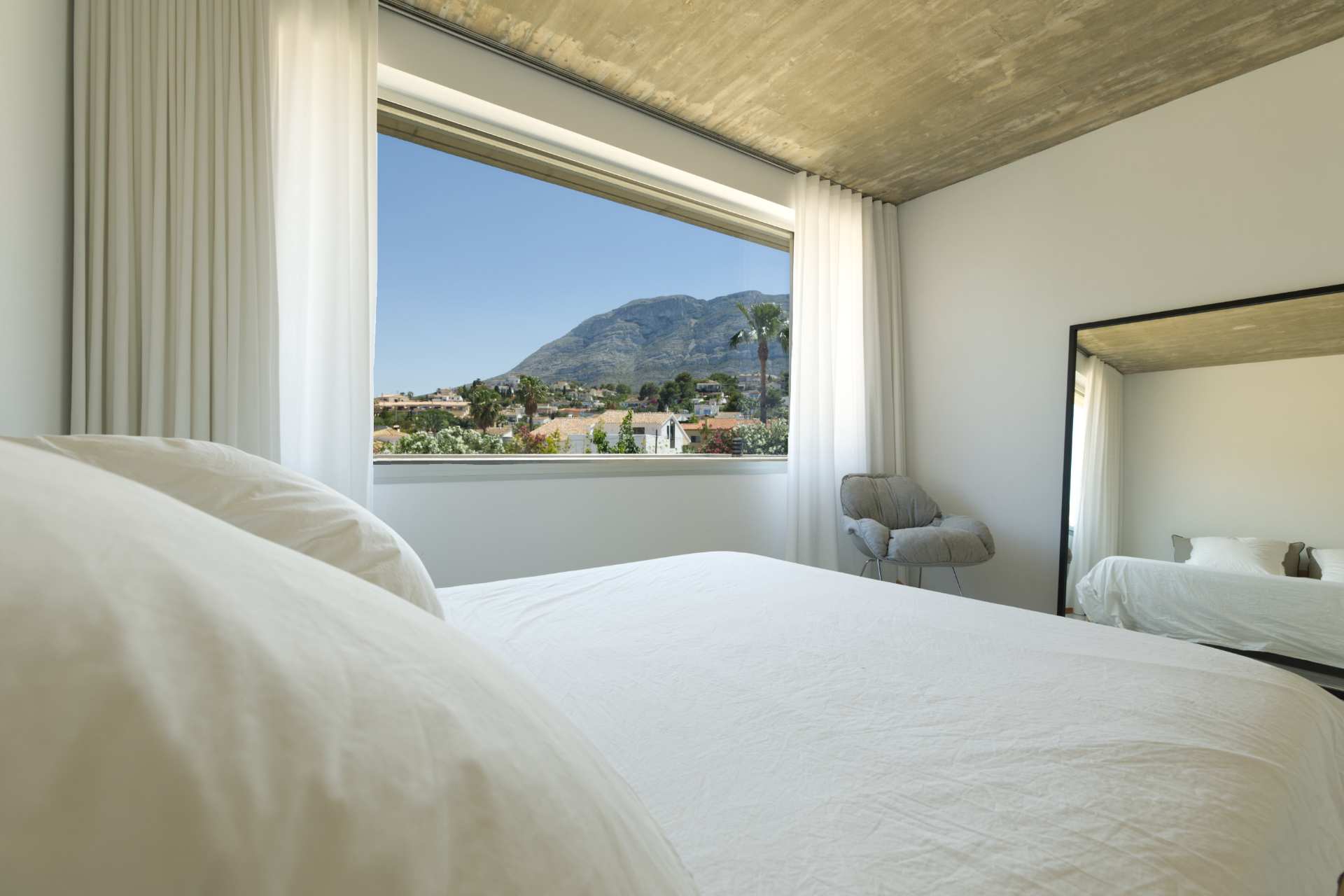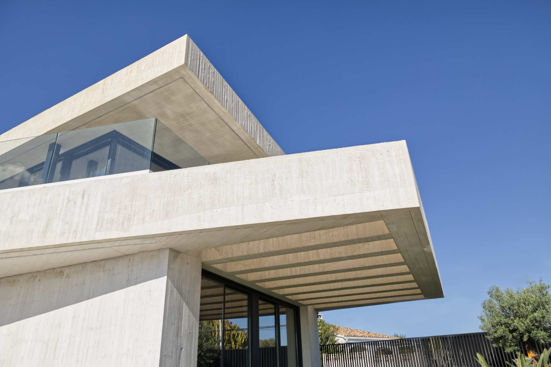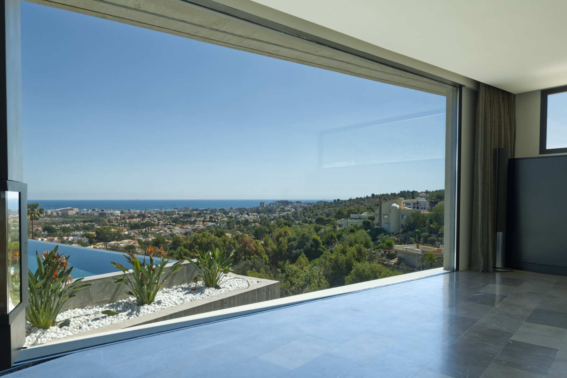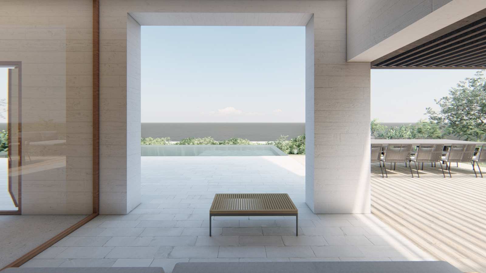 "Una vivienda en hormigón blanco con unas maravillosas vistas a Dénia que emerge como una escultura, con un gran voladizo y con el fuerte objetivo de no poner barandillas ni ningún elemento que interrumpiese esas vistas."