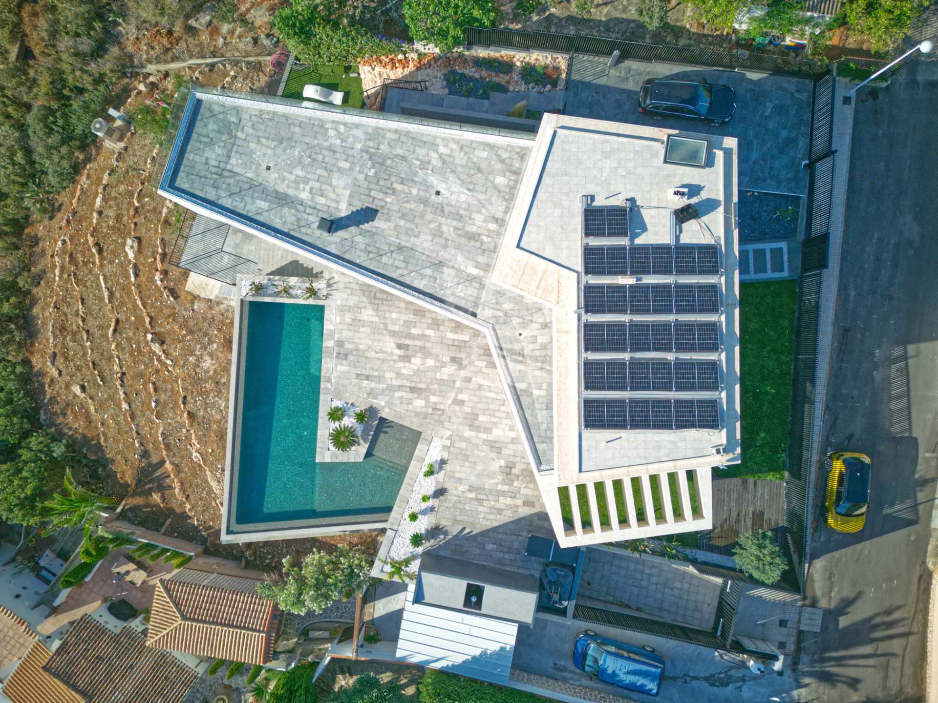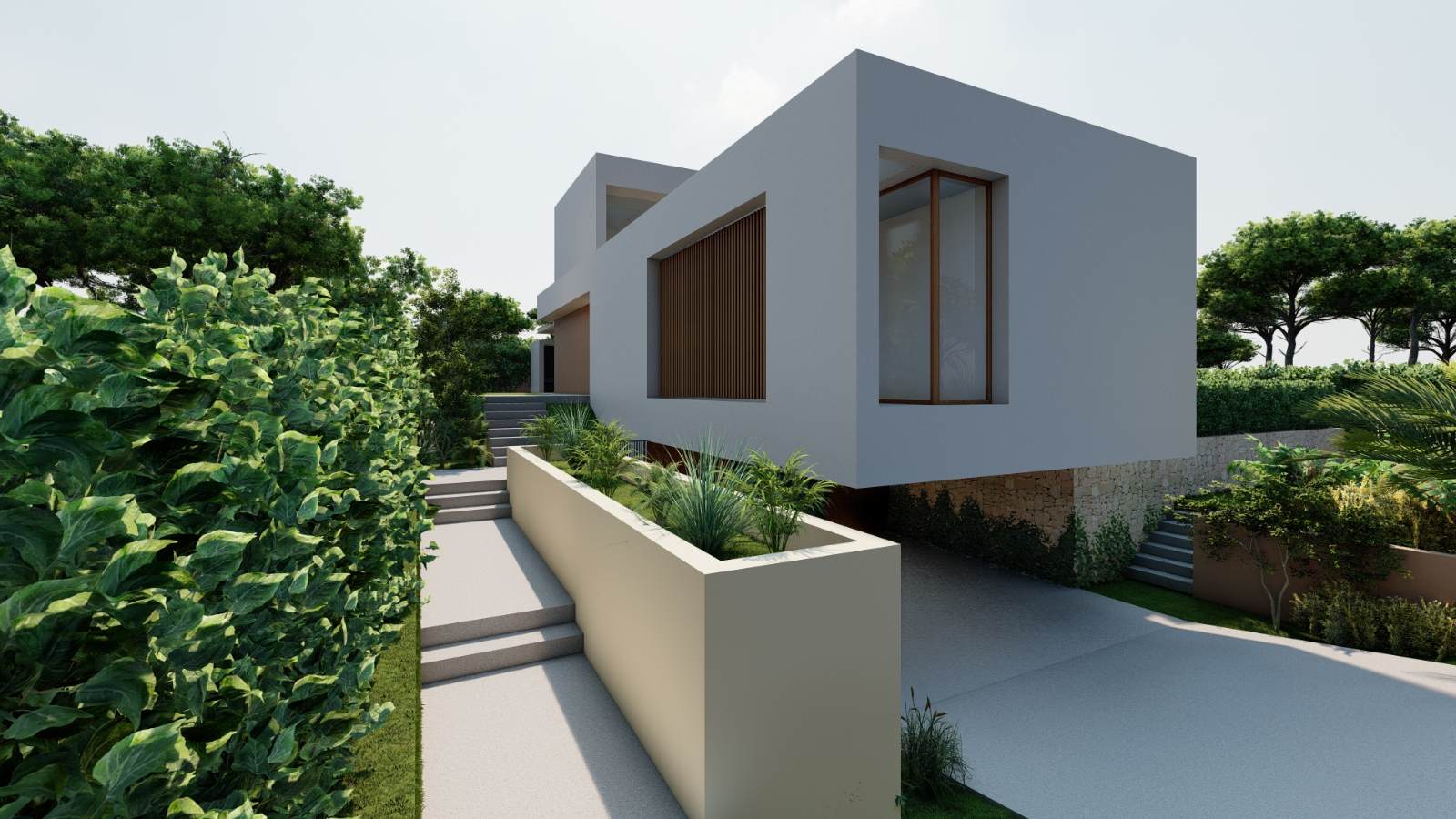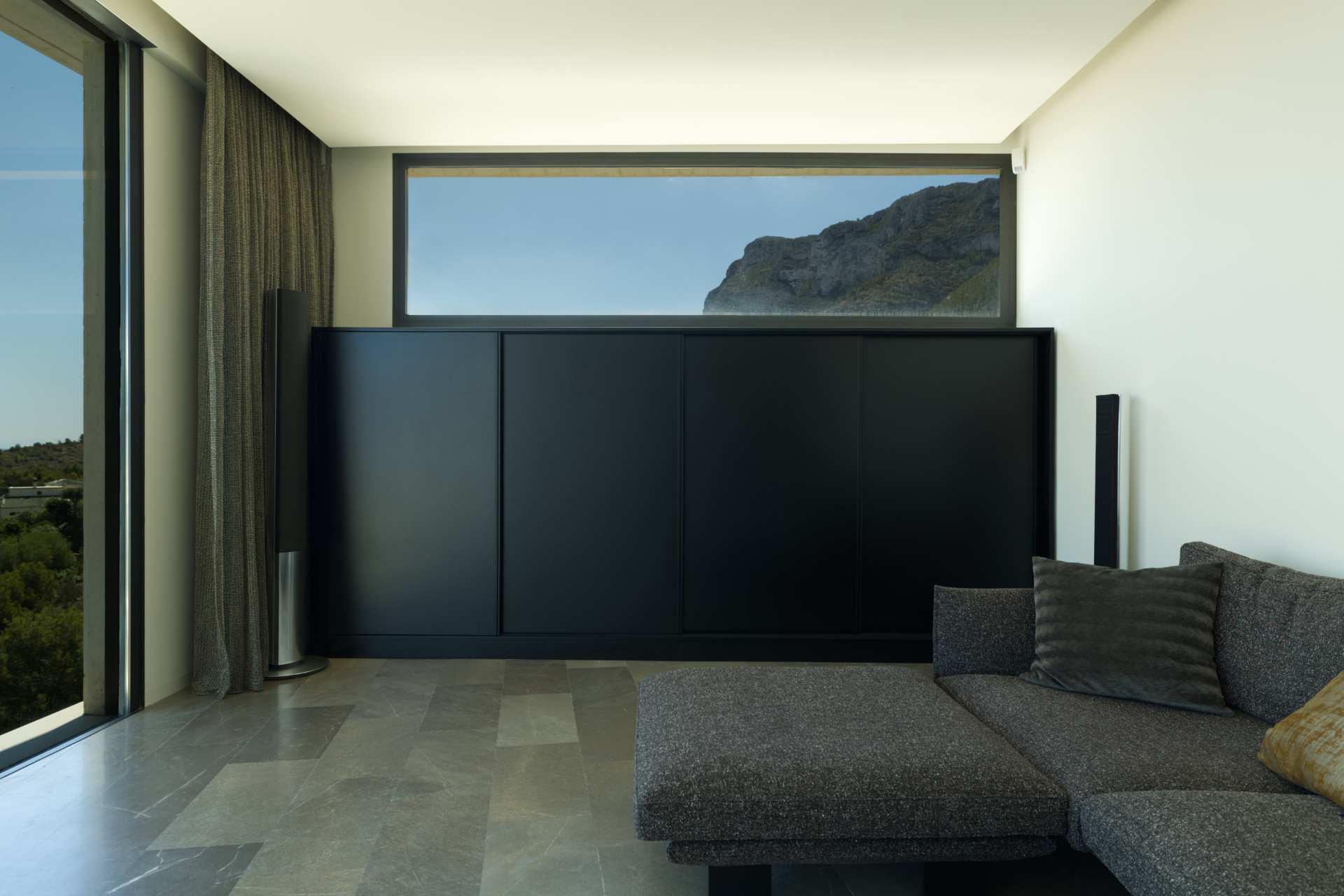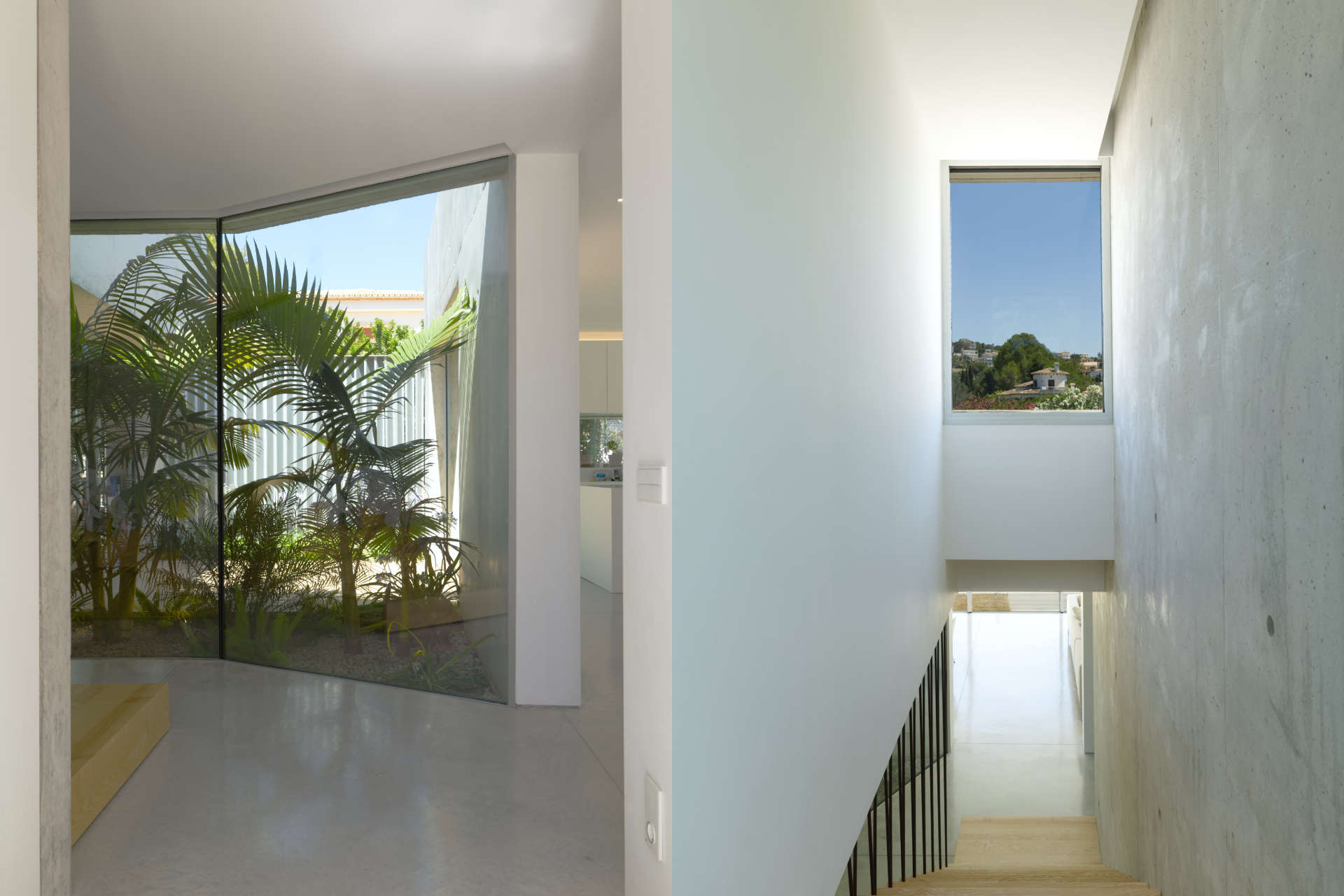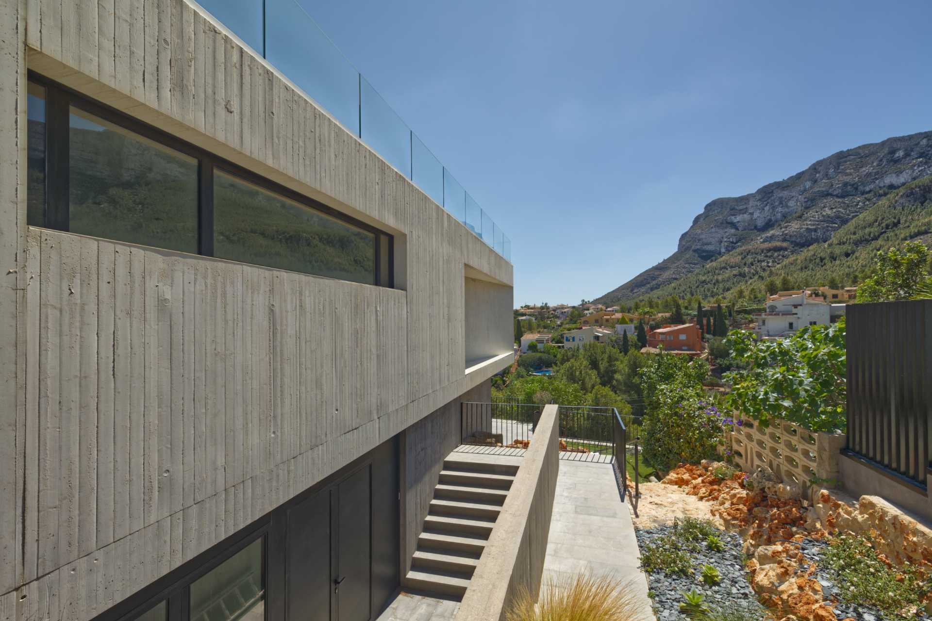 "Diseño en forma de L que se posa sobre un terreno con mucha pendiente y que genera un sótano habitable gracias a un patio inglés central, unas cajas de zona principal y dormitorios separados por el acceso principal y a modo de mirador, una suite en planta primera con impresionantes vistas a Dénia."