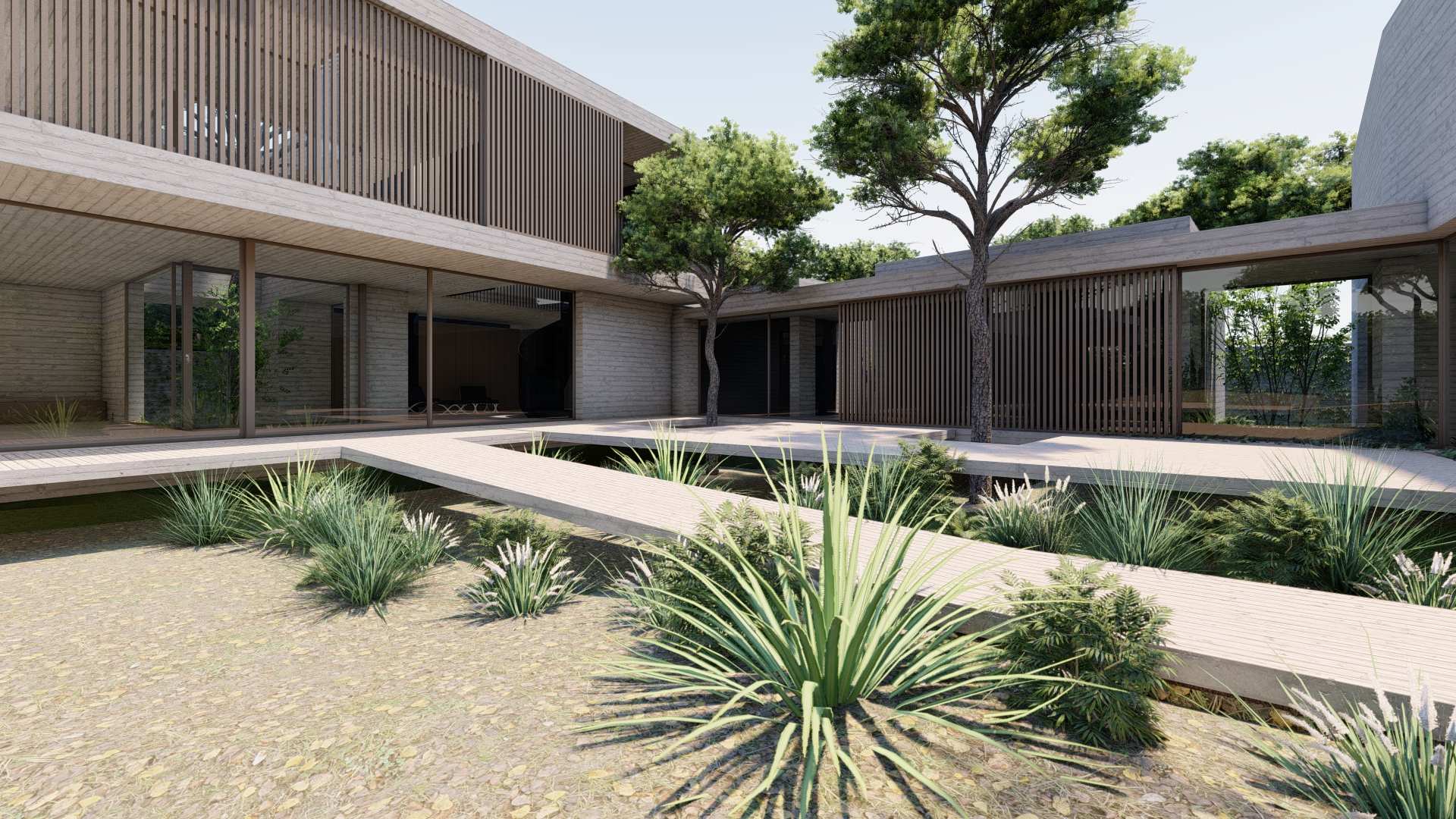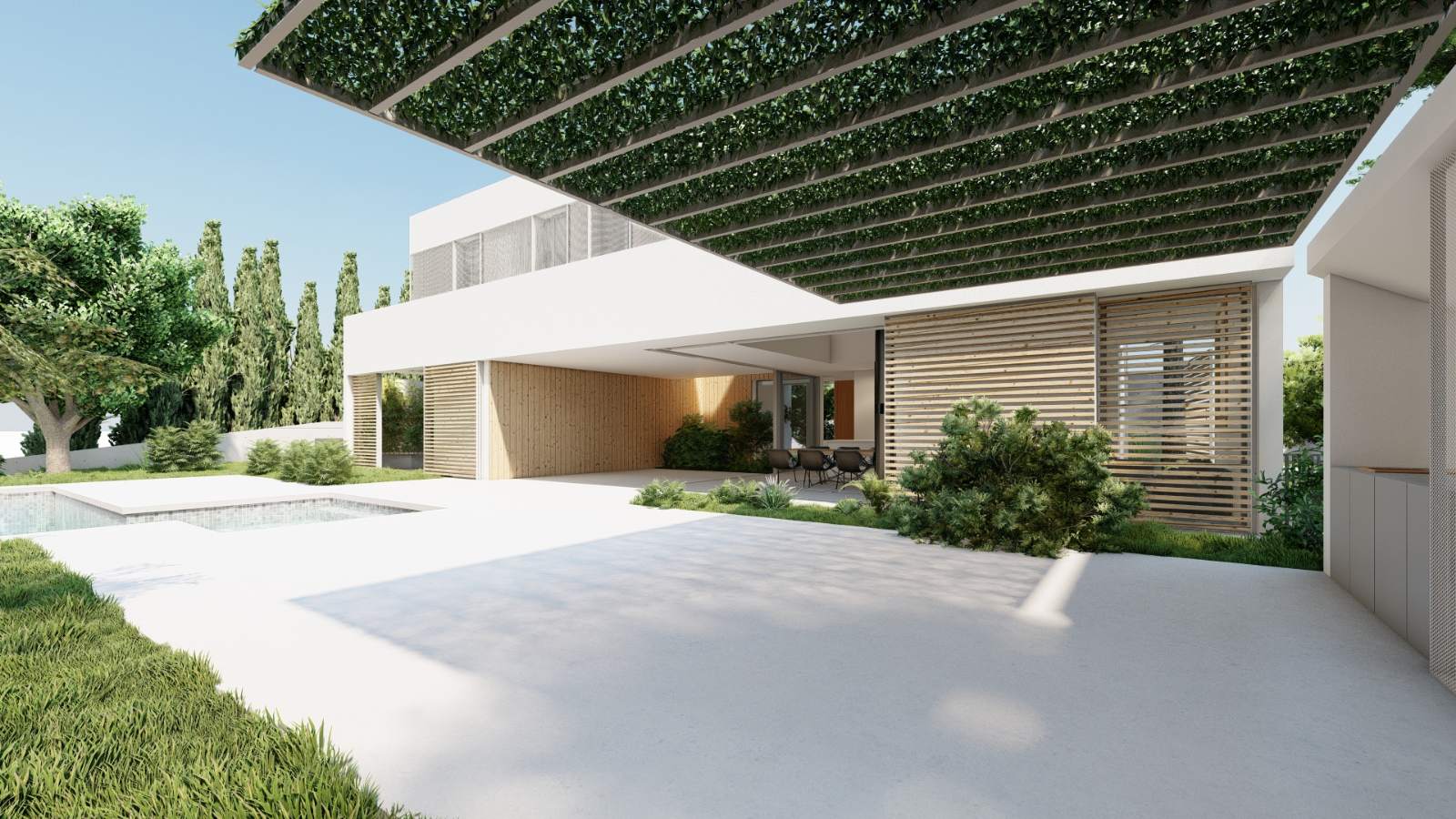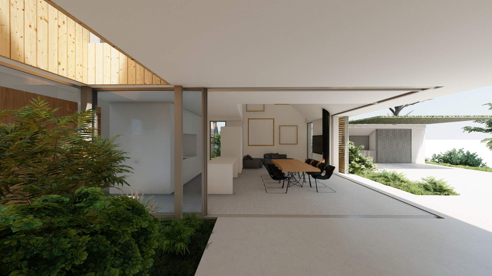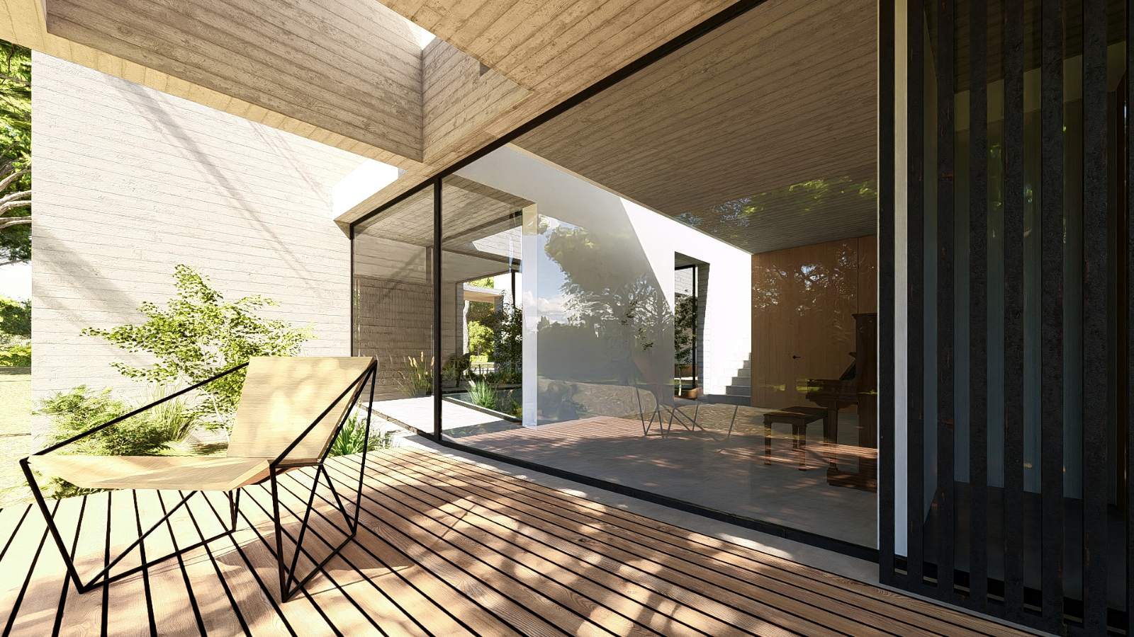 "Vivienda que relaciona los espacios principales de salón-comedor-cocina con un módulo para invitados mediante un espacio exterior central cubierto que es el centro. El control solar aporta una personalidad a la vivienda."
