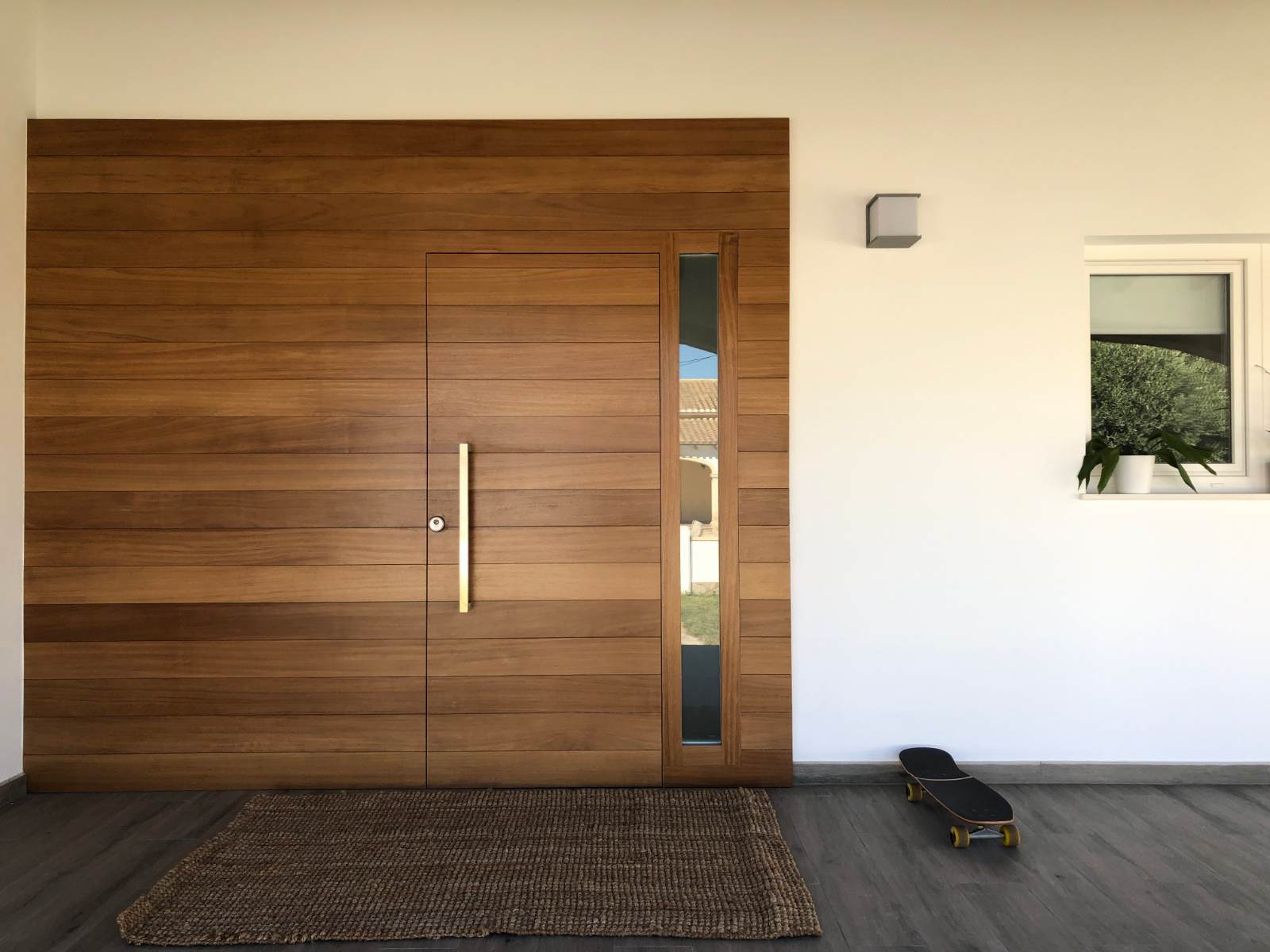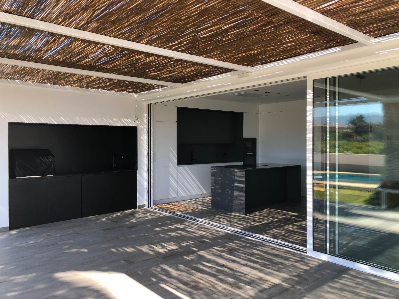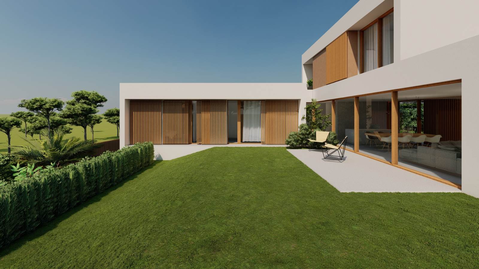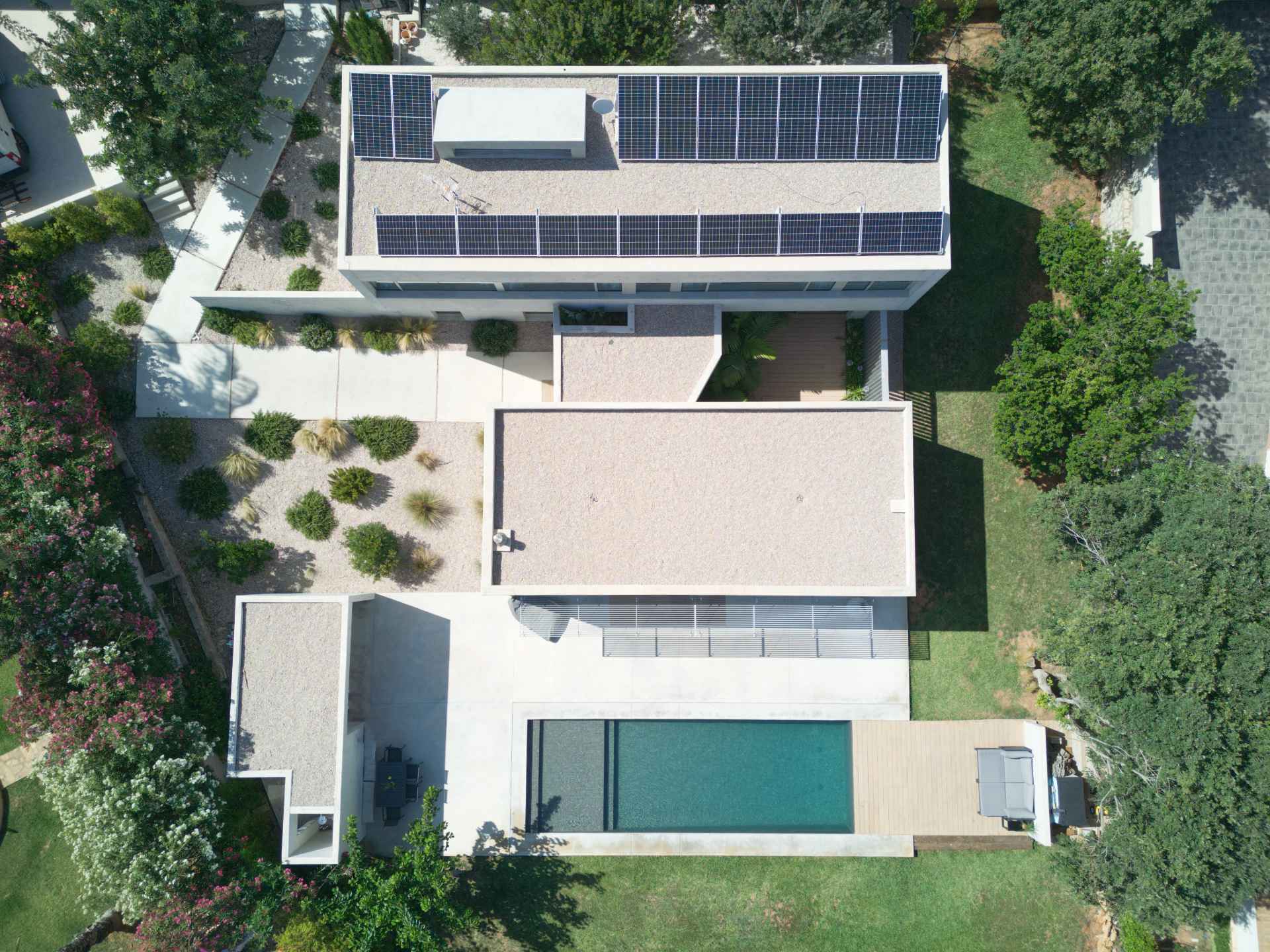 "Vivienda que relaciona los espacios principales de salón-comedor-cocina con un módulo para invitados mediante un espacio exterior central cubierto que es el centro. El control solar aporta una personalidad a la vivienda."