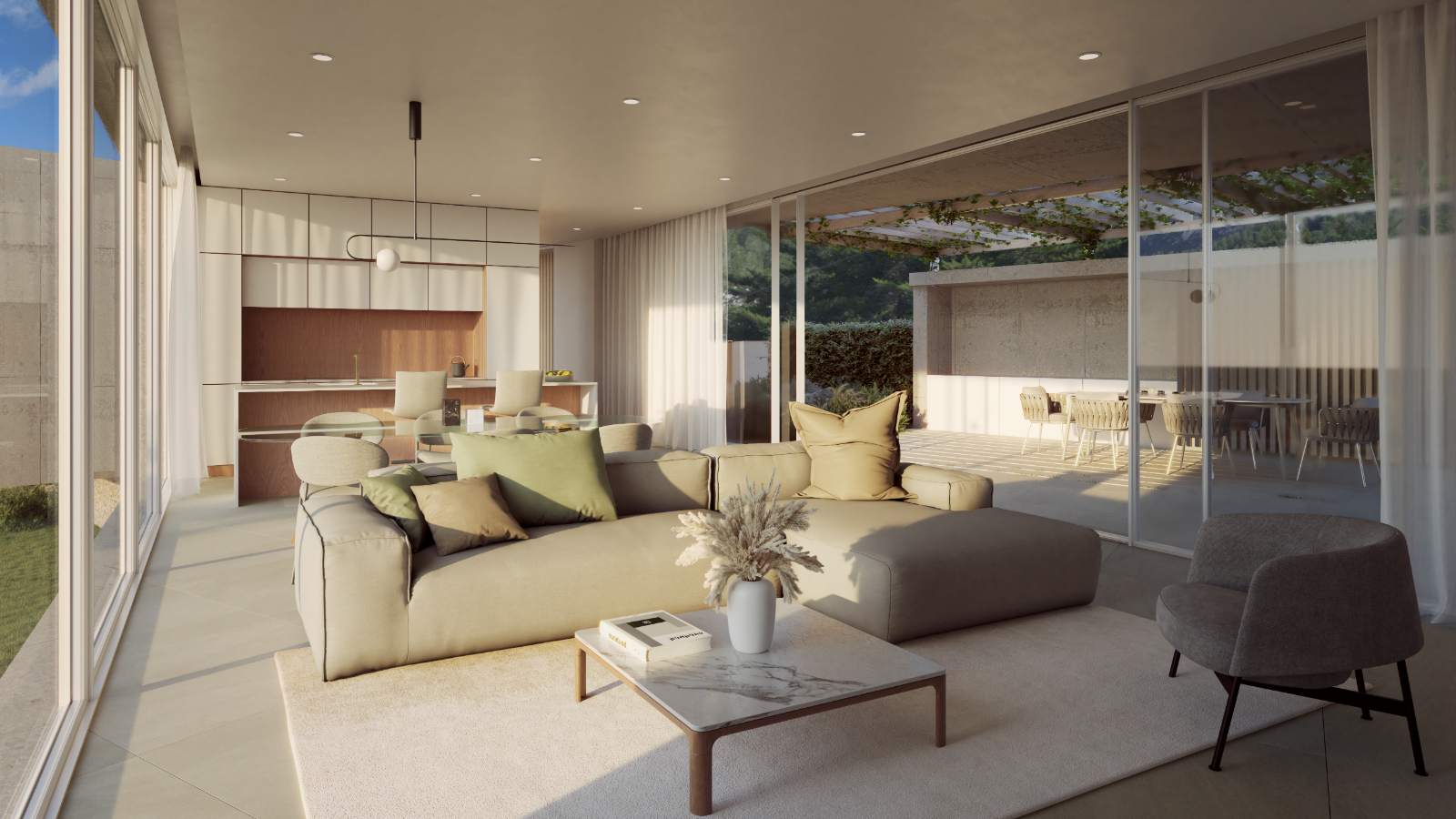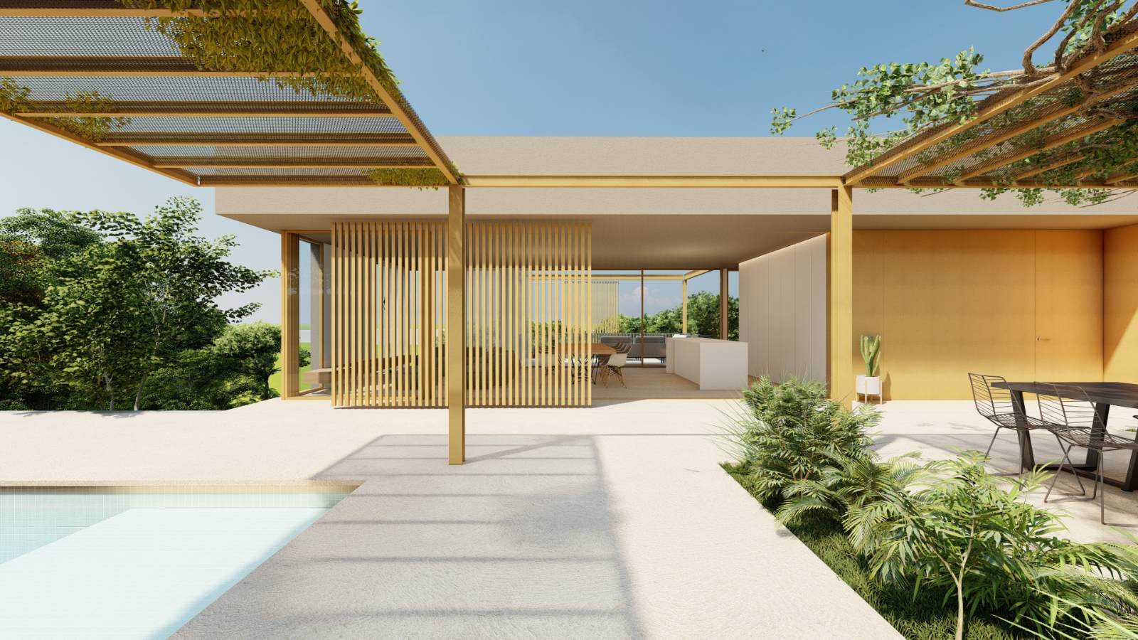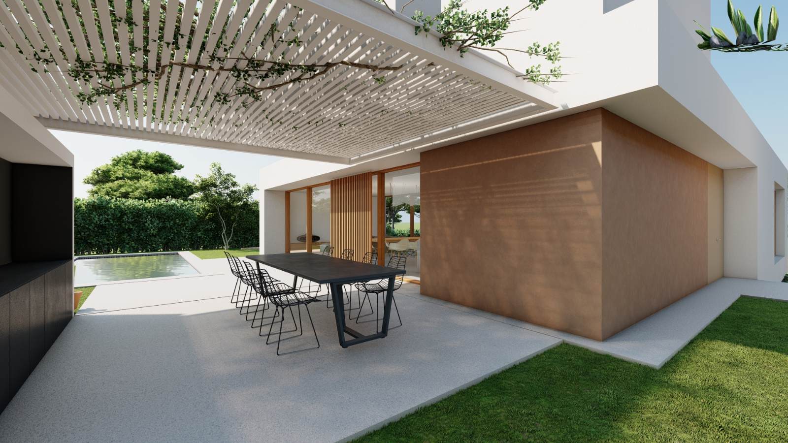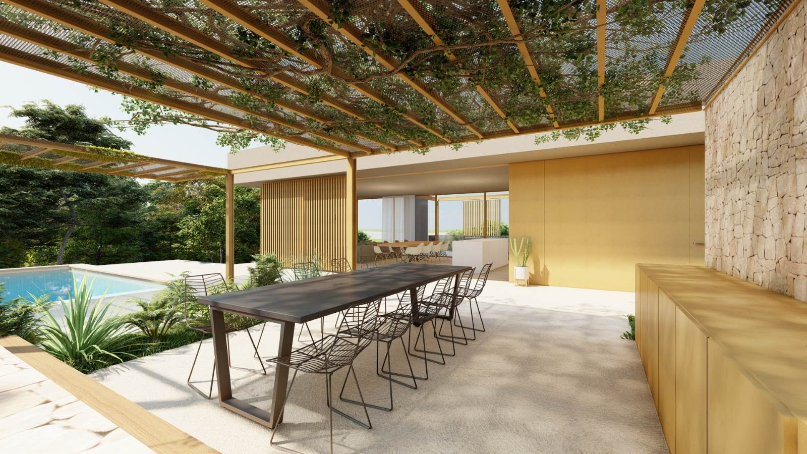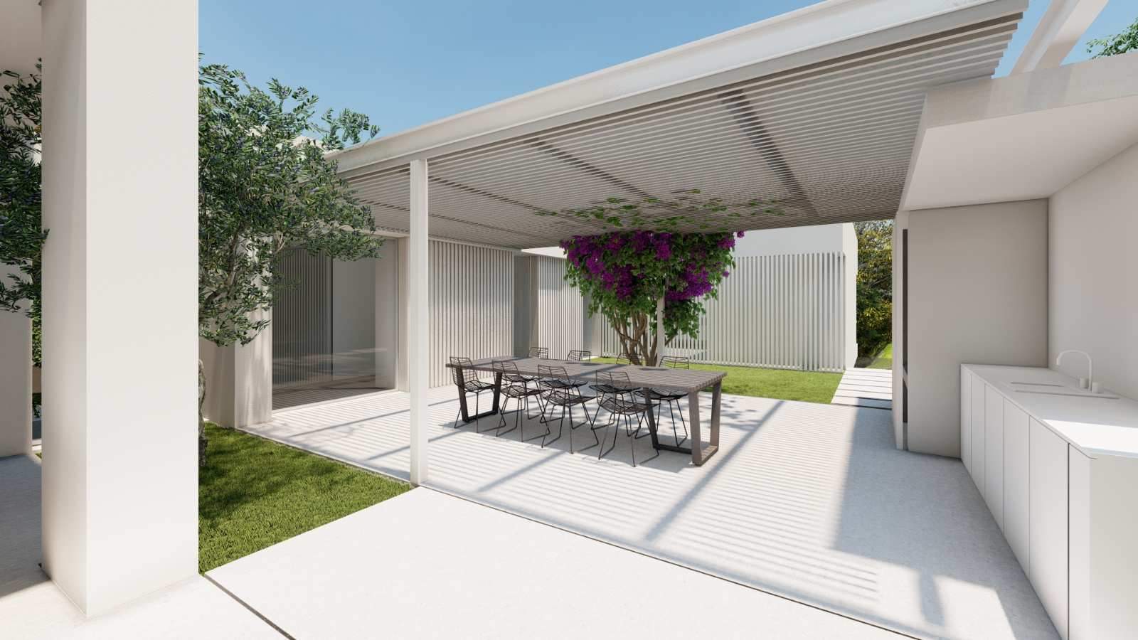 "Urbanización de viviendas con espacios privados que constan de una sola planta y que tienen un concepto muy funcional conectándose a la terraza pérgolada y a la zona de comedor exterior de una manera muy sutil ayudándose de un patio."