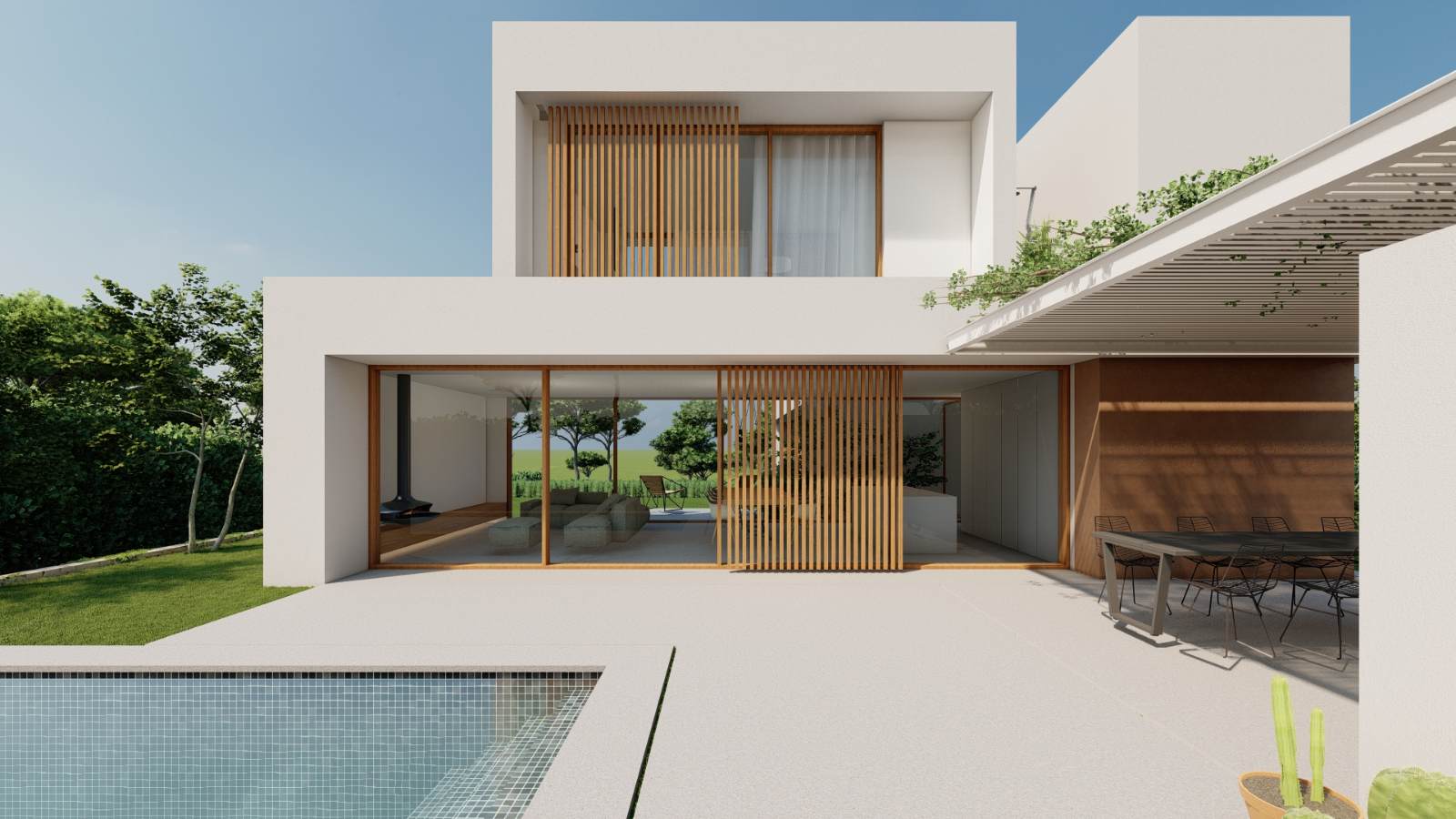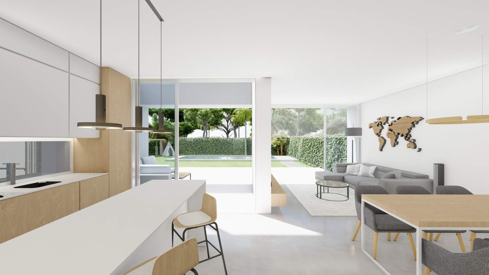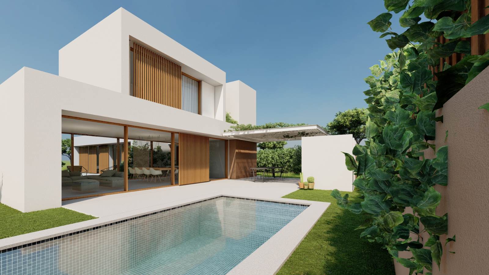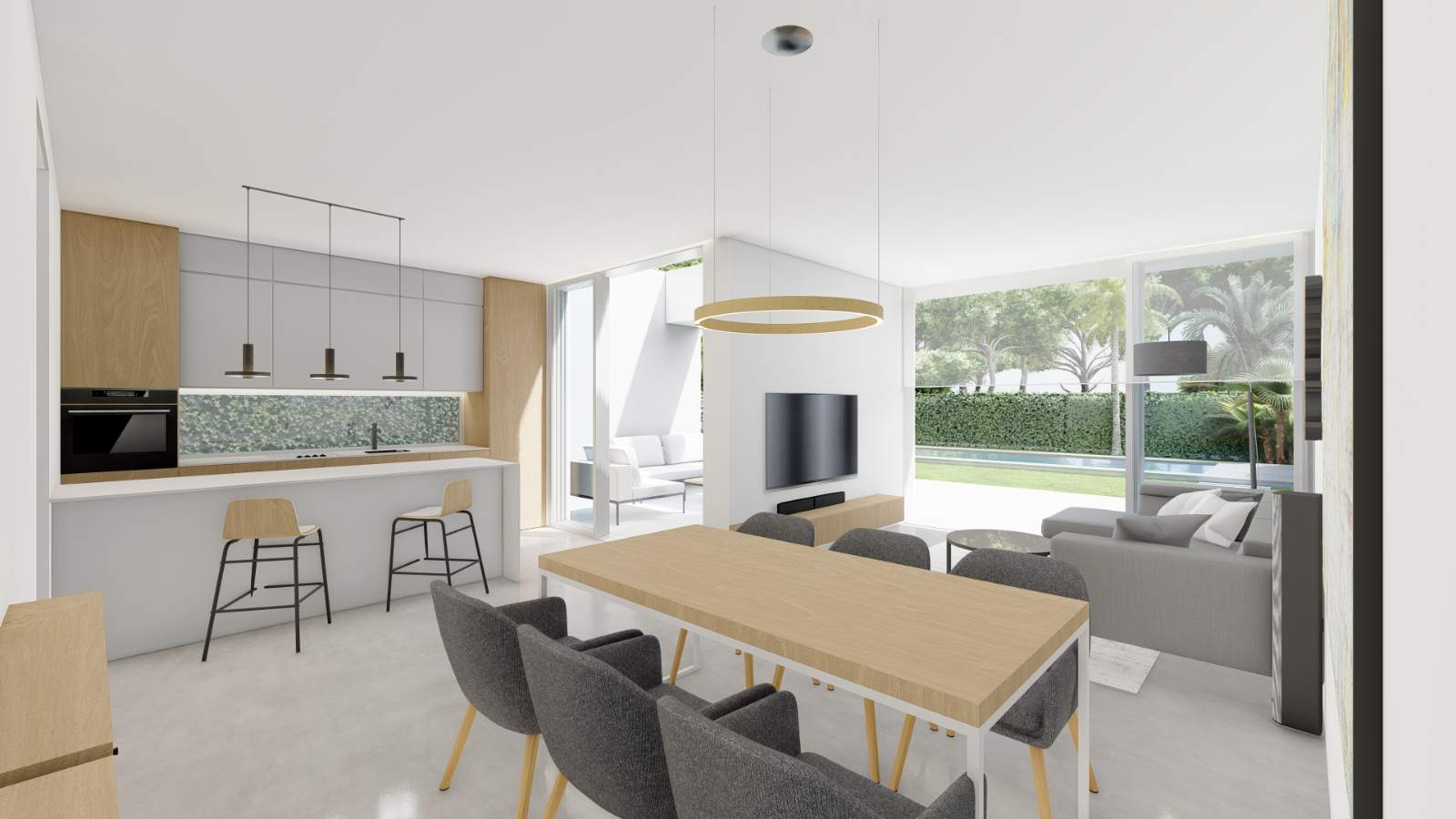 "Urbanización de viviendas con espacios privados que constan de una sola planta y que tienen un concepto muy funcional conectándose a la terraza pérgolada y a la zona de comedor exterior de una manera muy sutil ayudándose de un patio."