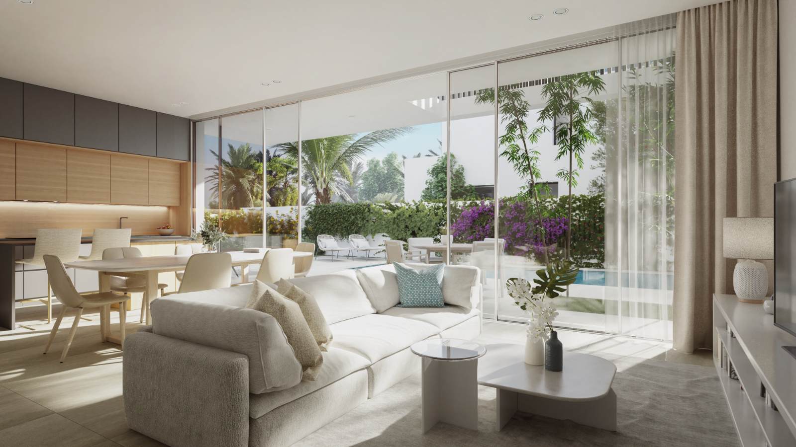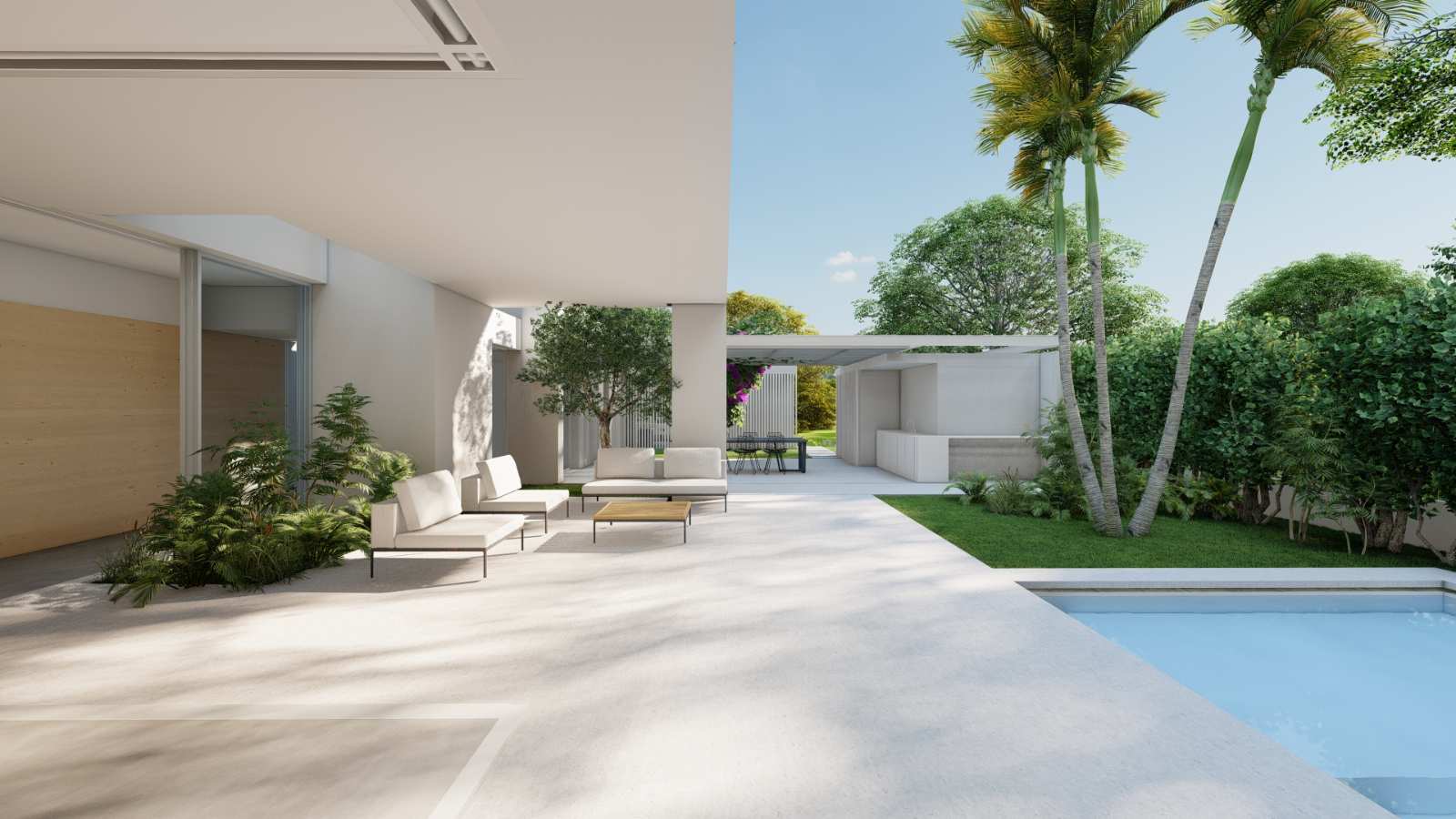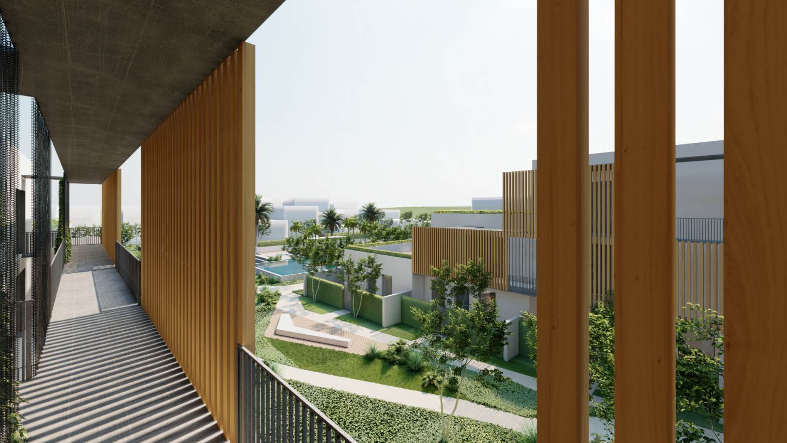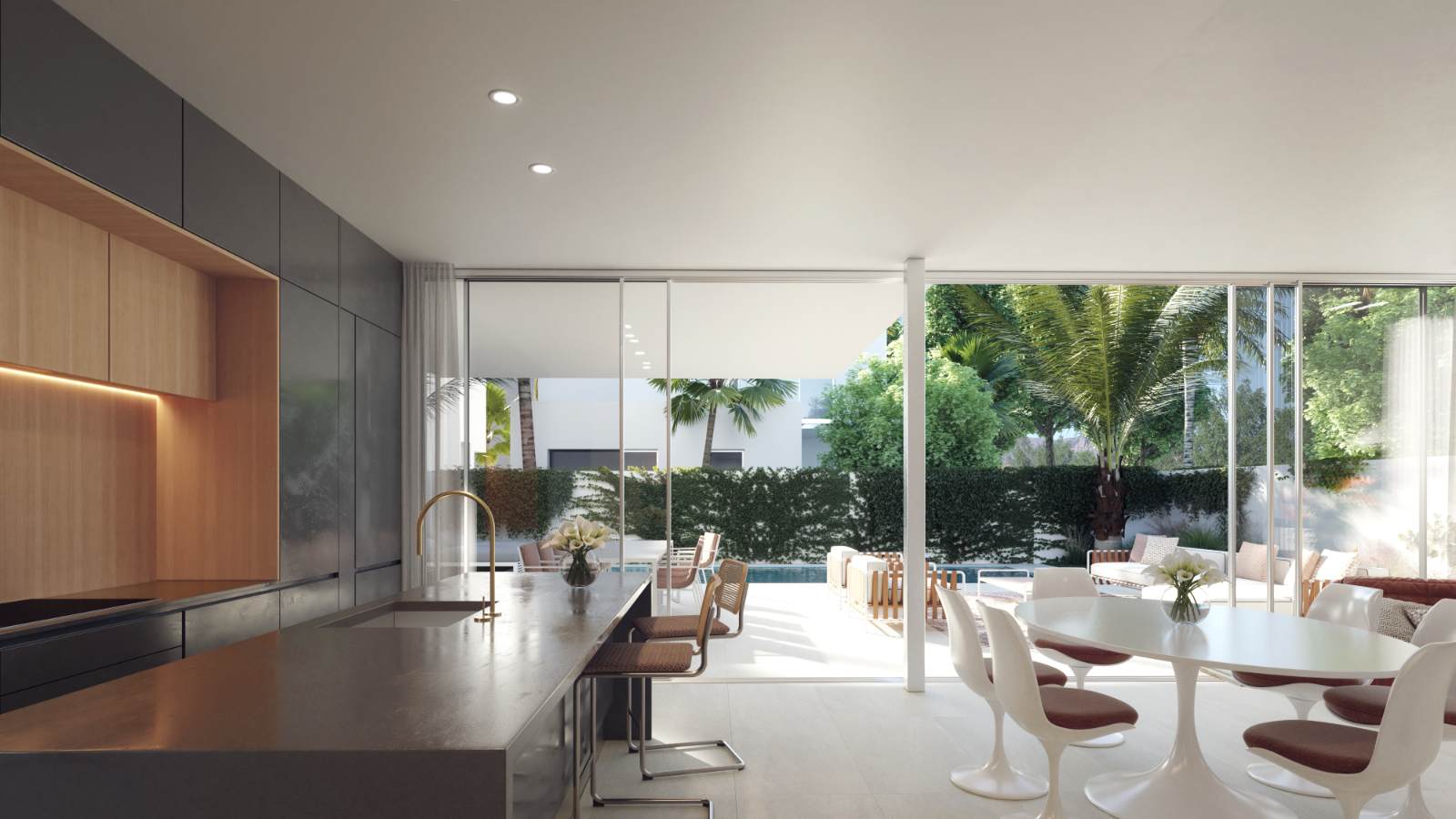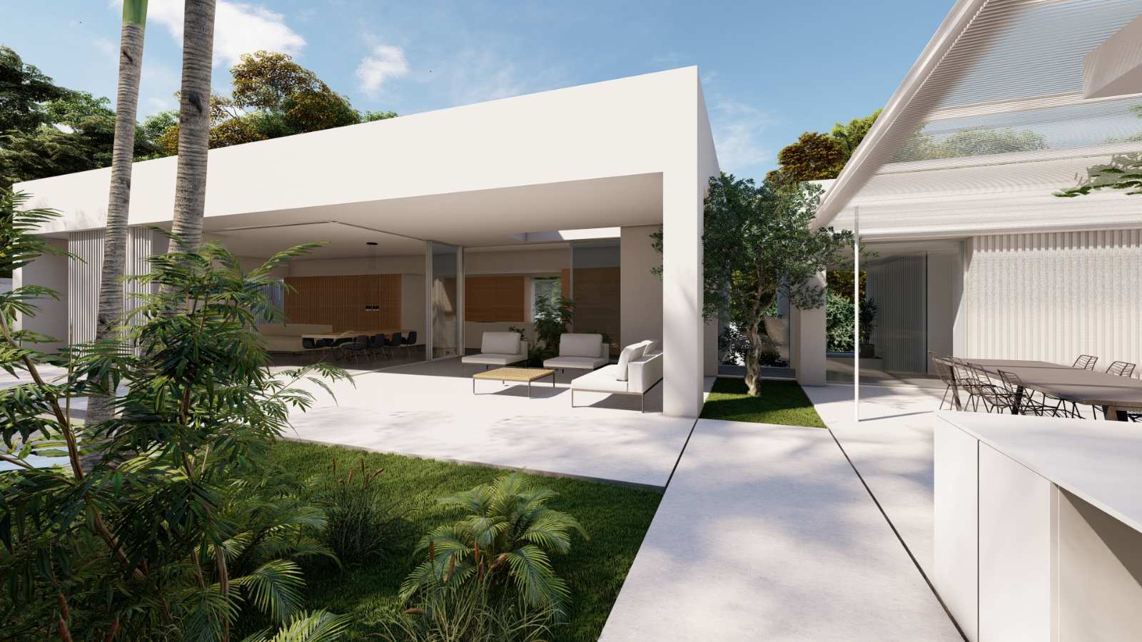 "Urbanización de viviendas con espacios privados que constan de una sola planta y que tienen un concepto muy funcional conectándose a la terraza pérgolada y a la zona de comedor exterior de una manera muy sutil ayudándose de un patio."