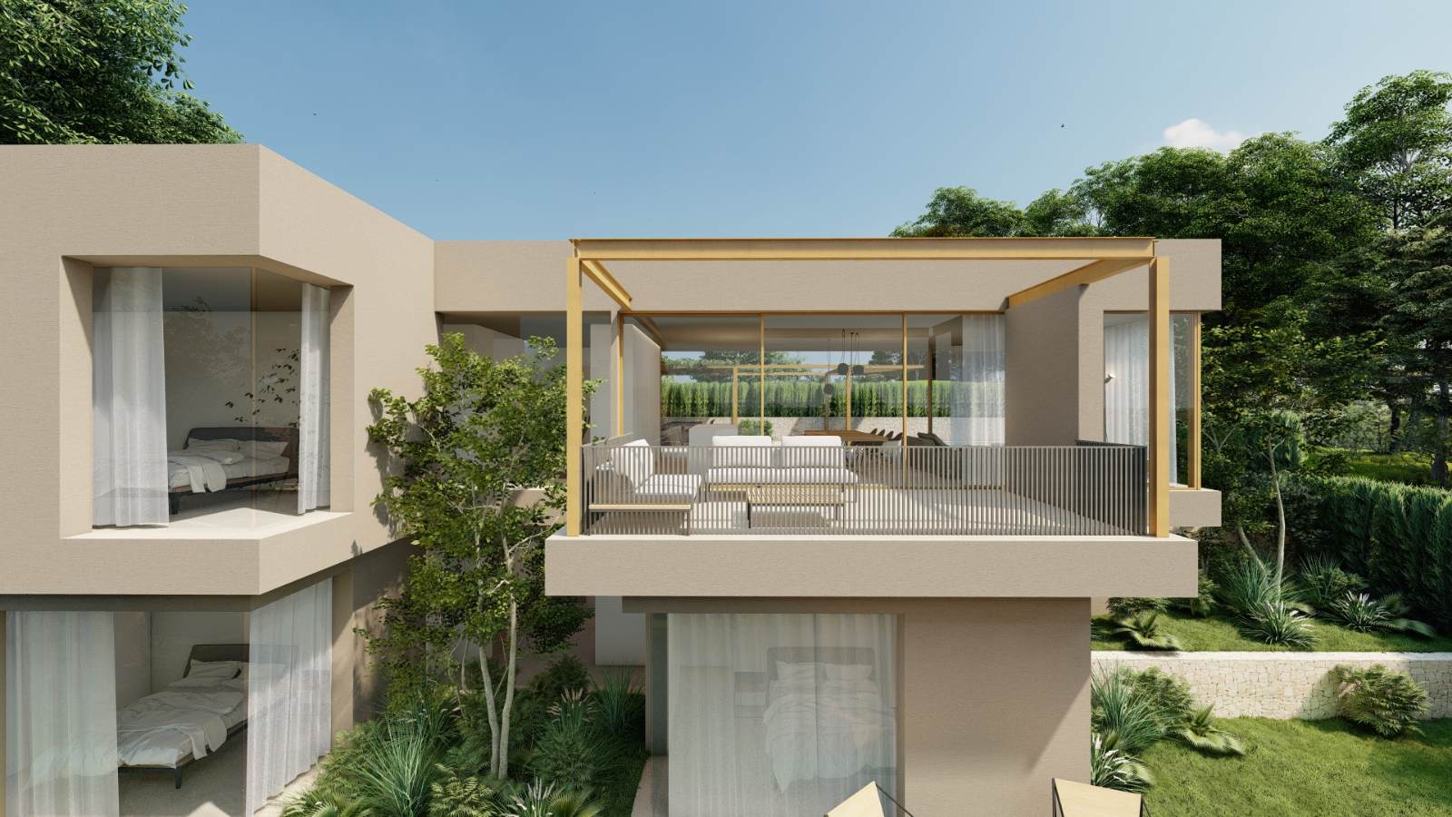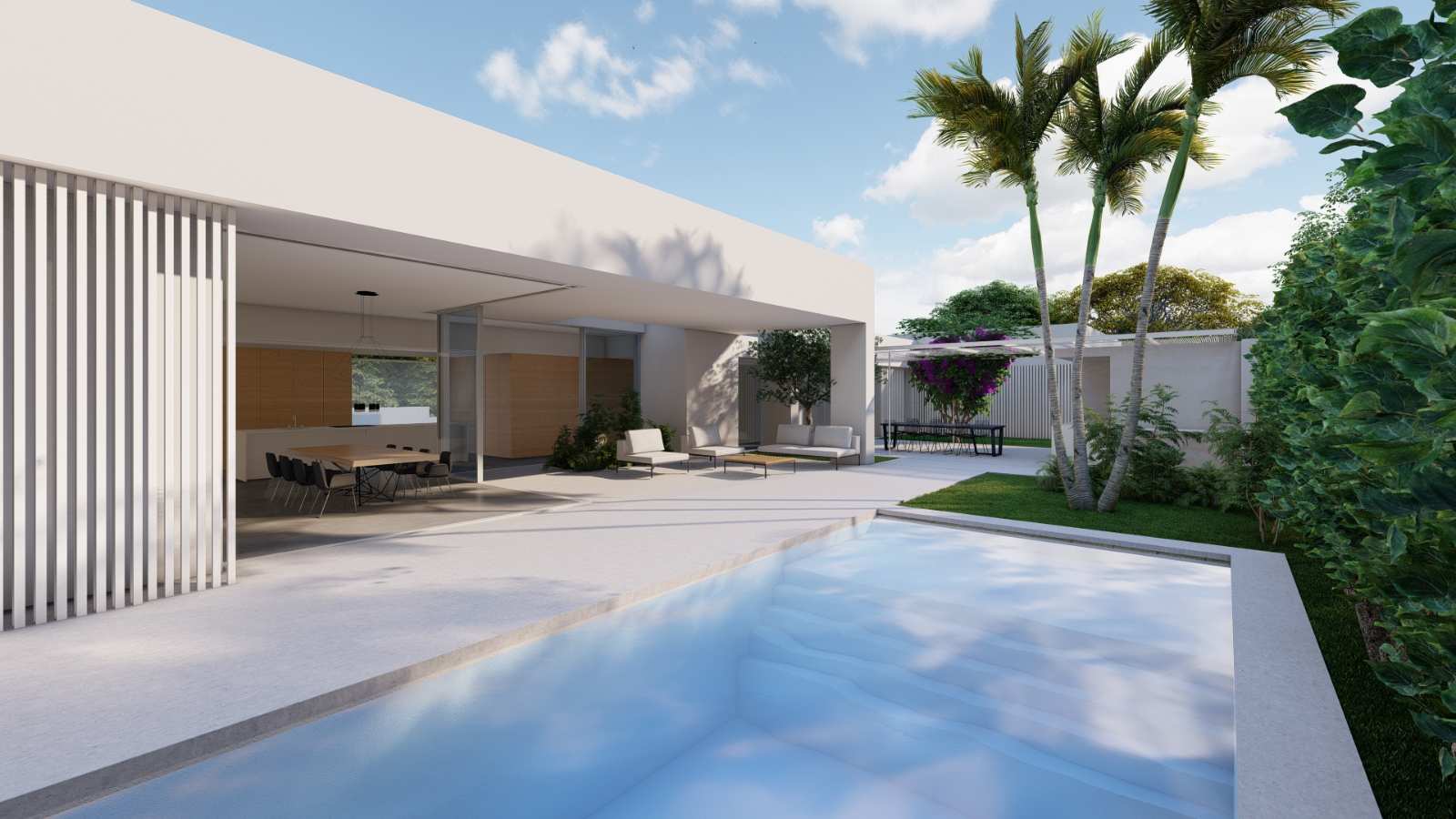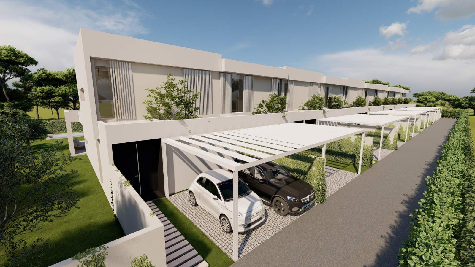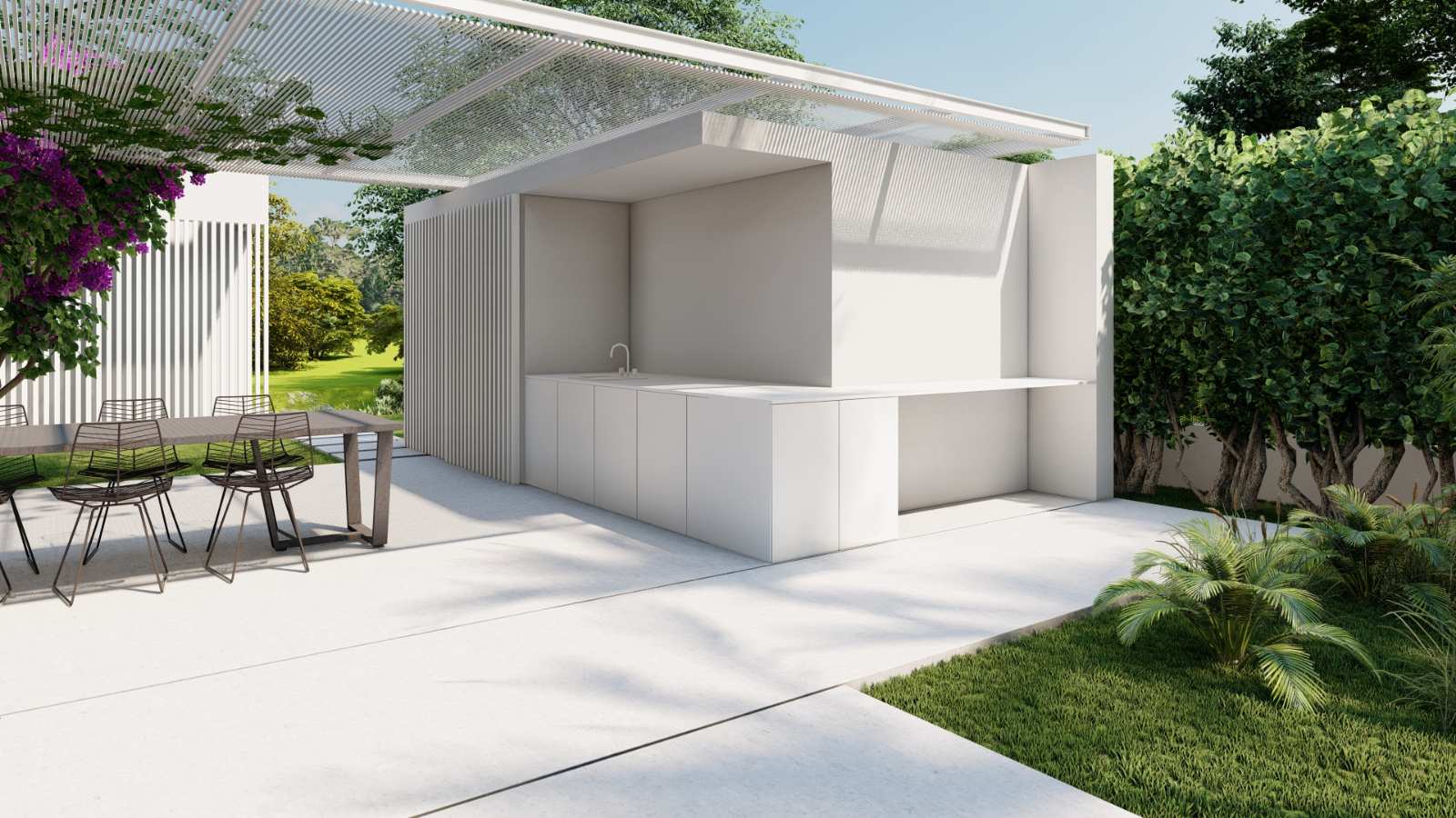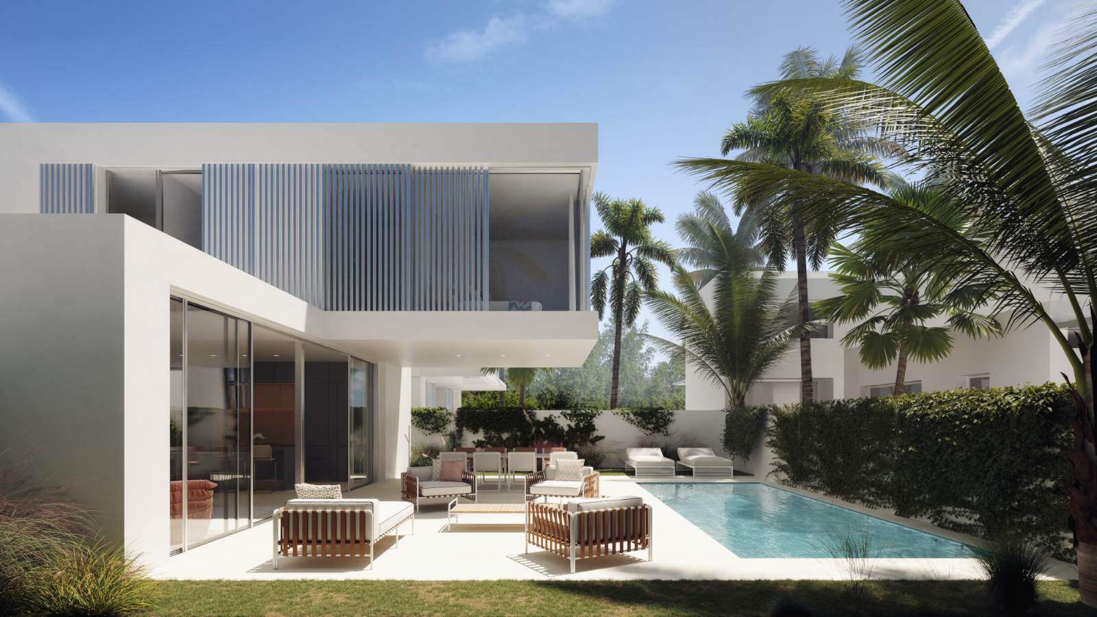 "Urbanización de viviendas con espacios privados que constan de una sola planta y que tienen un concepto muy funcional conectándose a la terraza pérgolada y a la zona de comedor exterior de una manera muy sutil ayudándose de un patio."