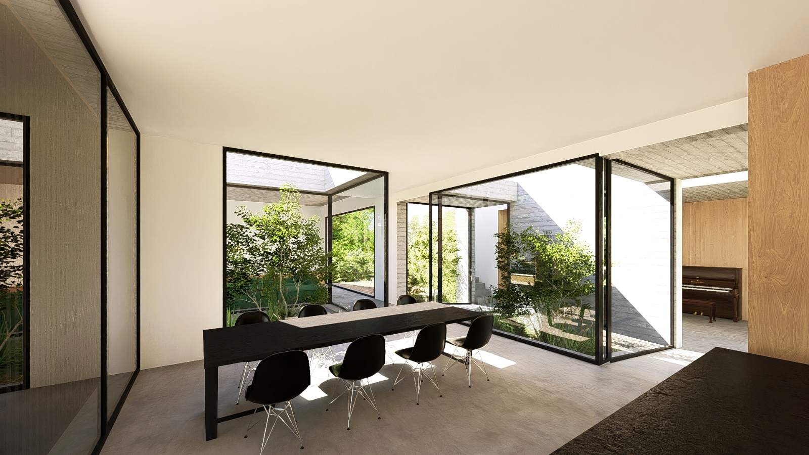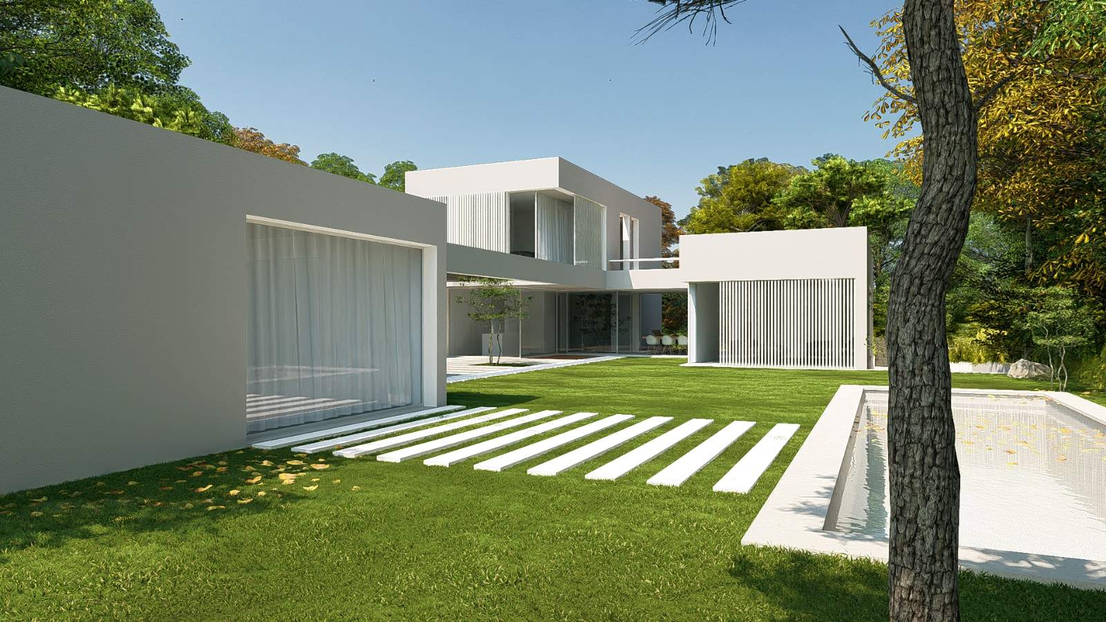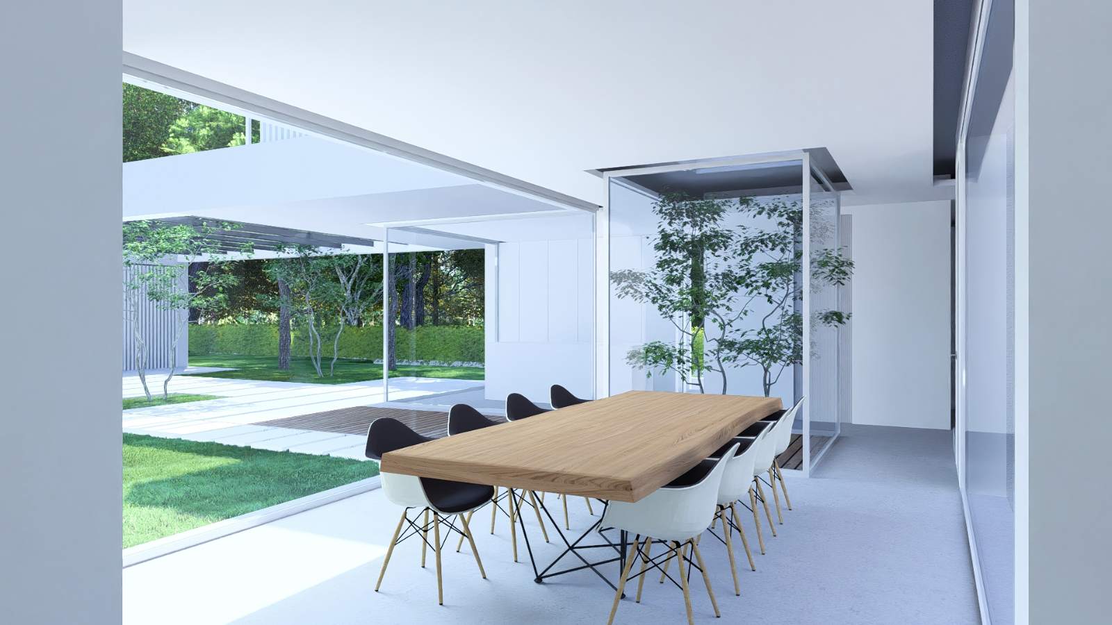 "Diseño que rompe la barrera entre el interior y el exterior difuminando los límites entre vivienda y un jardín con mucho protagonismo y con unas grandes aperturas al exterior."