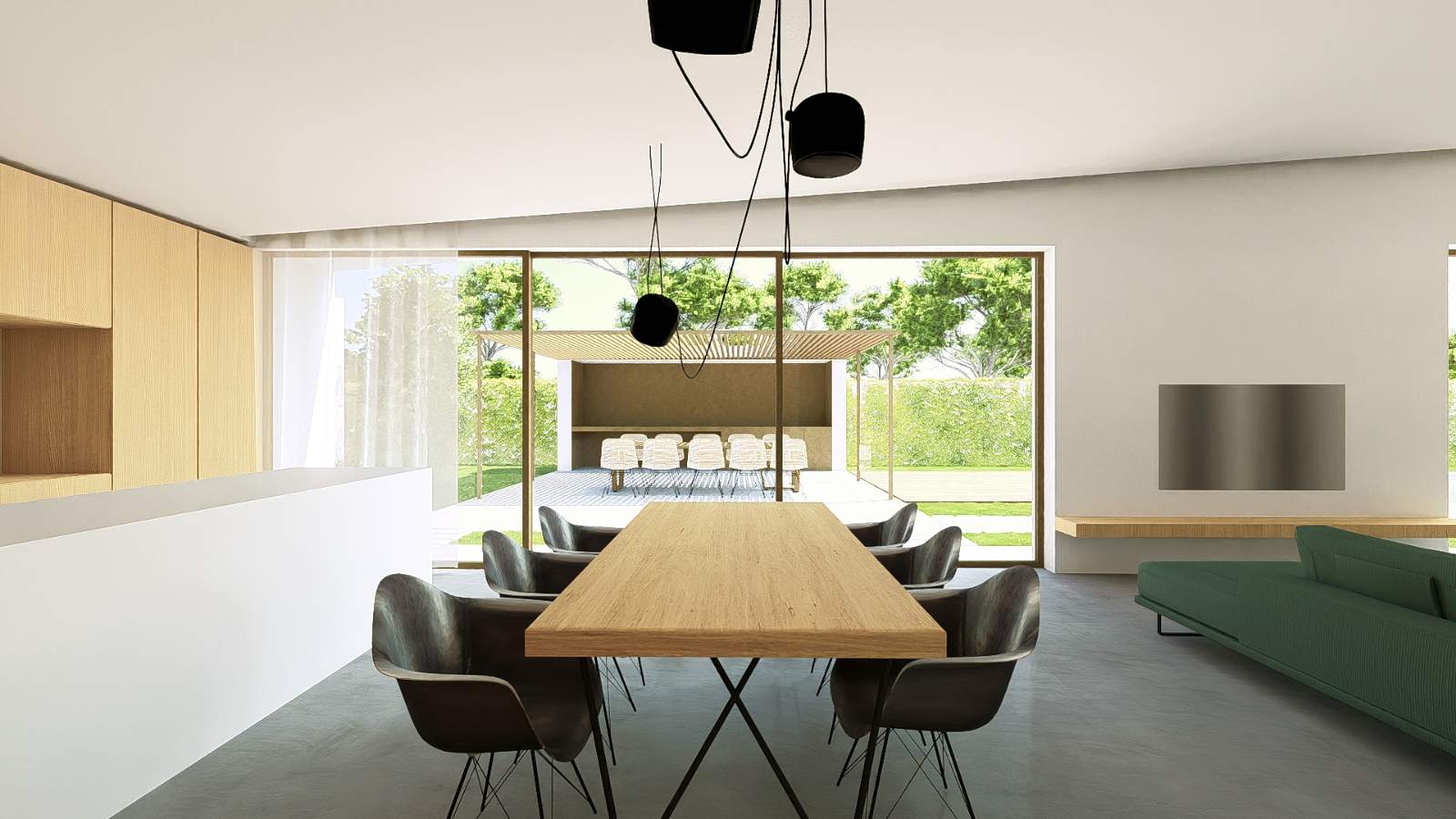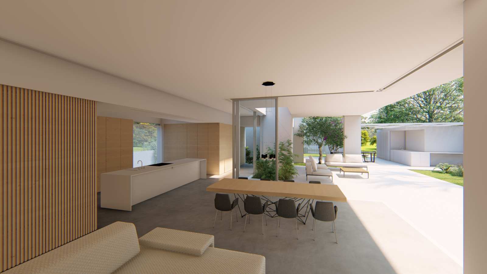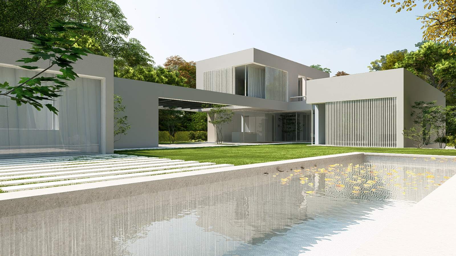 "Diseño que rompe la barrera entre el interior y el exterior difuminando los límites entre vivienda y un jardín con mucho protagonismo y con unas grandes aperturas al exterior."