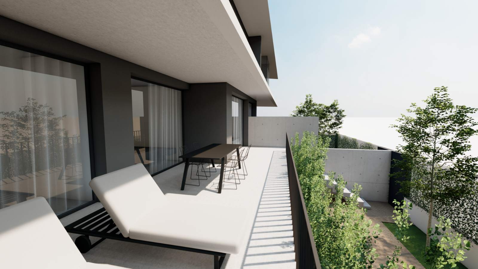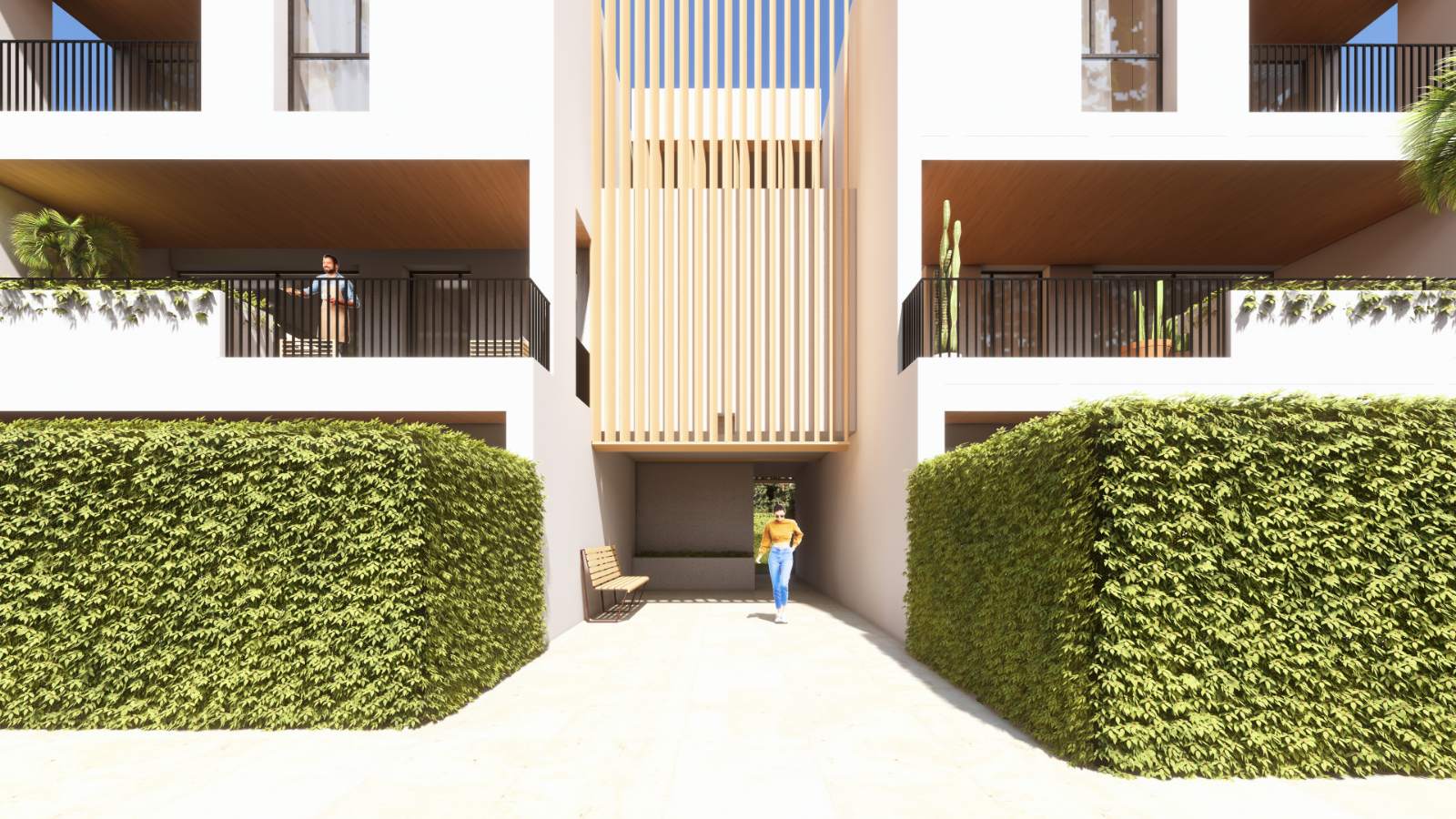 "Urbanización de 28 viviendas con zona comunitaria exterior, piscina y zona social. El reto consistía en diseñar una edificación ligera, de construcción en seco y con espacios intermedios de acceso a las viviendas y terrazas de calidad que dieran personalidad a la construcción."