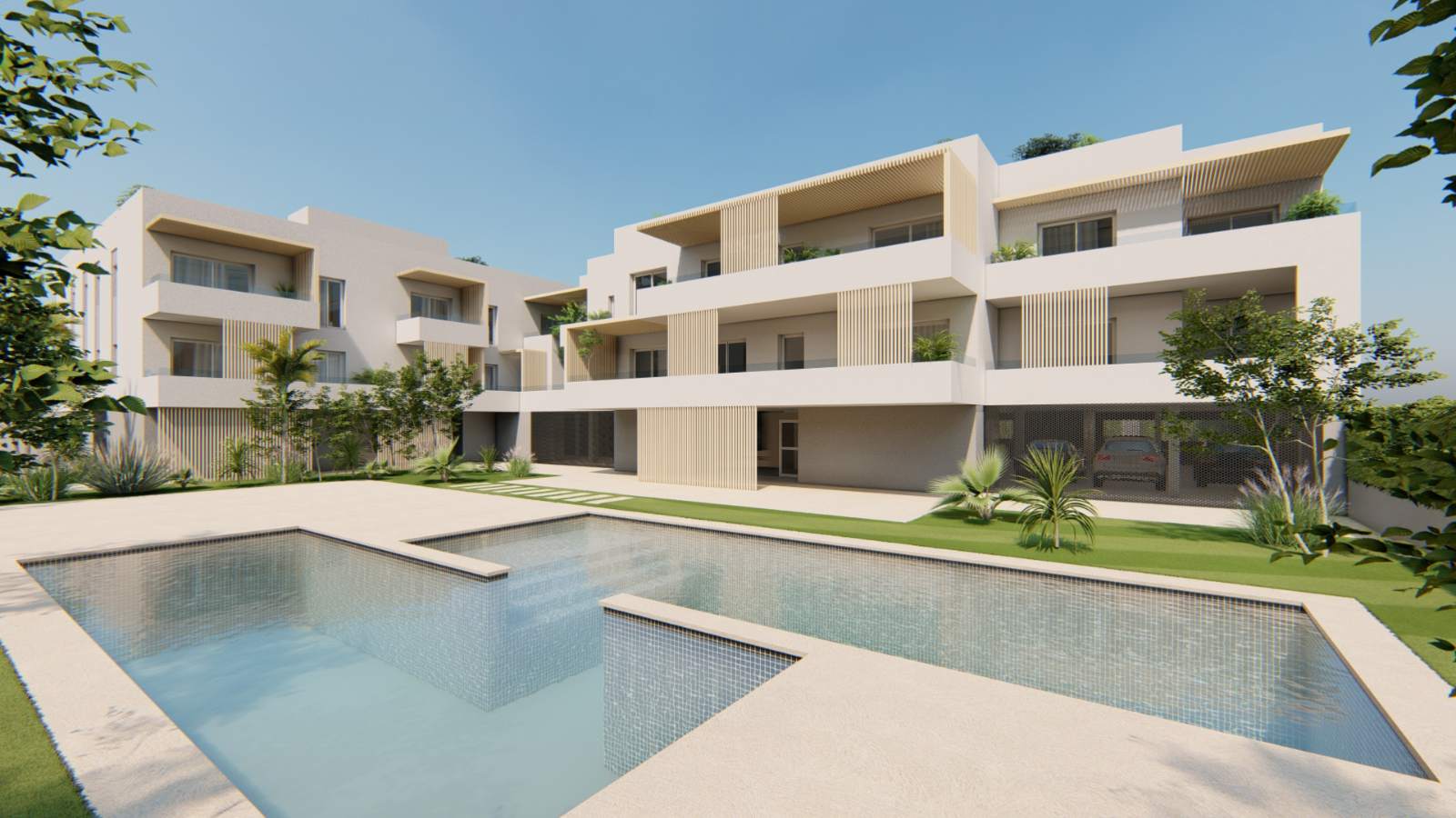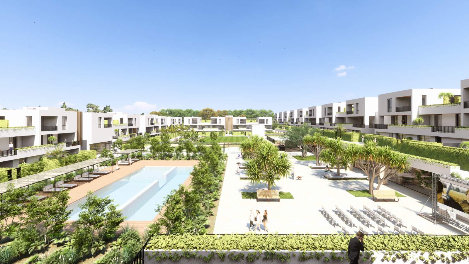"Urbanización de 16 apartamentos con varias tipologías que abrazan espacios comunitarios, piscina y jardines."
